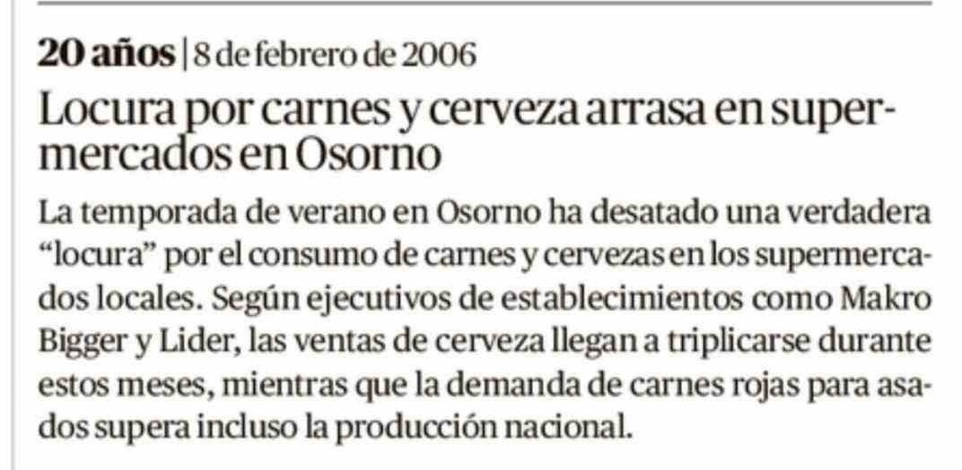 Título: 20 años | 8 de febrero de 2006 Locura por carnes y cerveza arrasa en supermercados en Osorno La temporada de verano en Osorno ha desatado una verdadera "locura" por el consumo de carnes y cervezas en los supermercados locales. Según ejecutivos de establecimientos como Makro Bigger y Lider, las venta