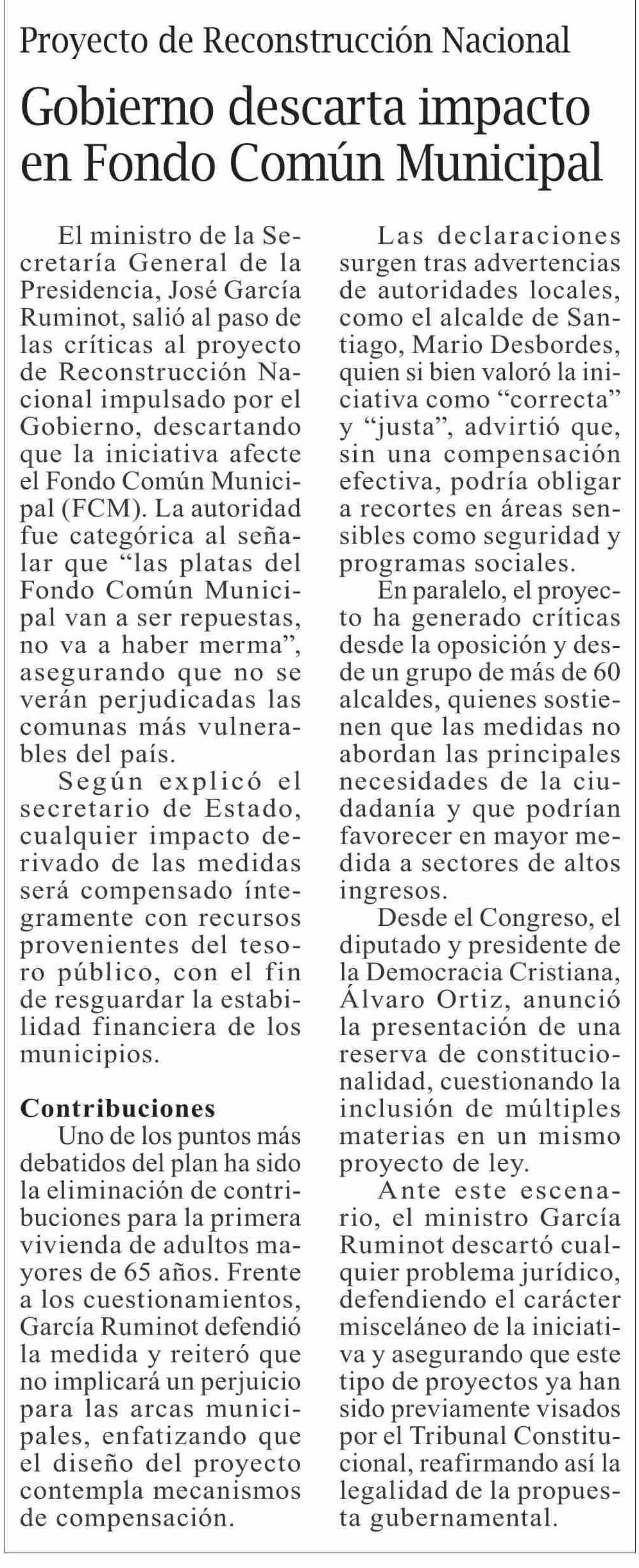 Gobierno descarta impacto en Fondo Común Municipal