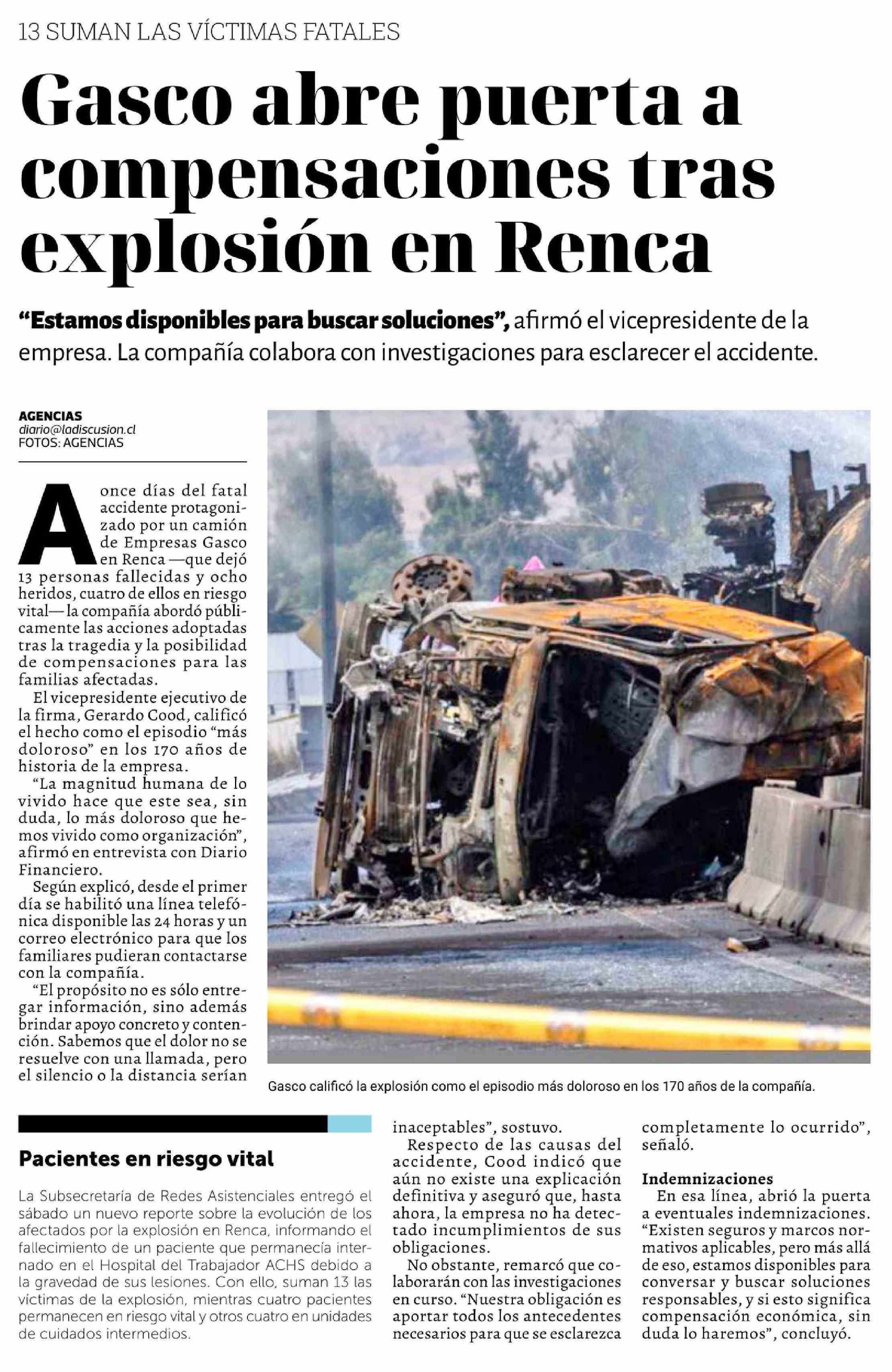 Gasco abre puerta a compensaciones tras explosión en Renca