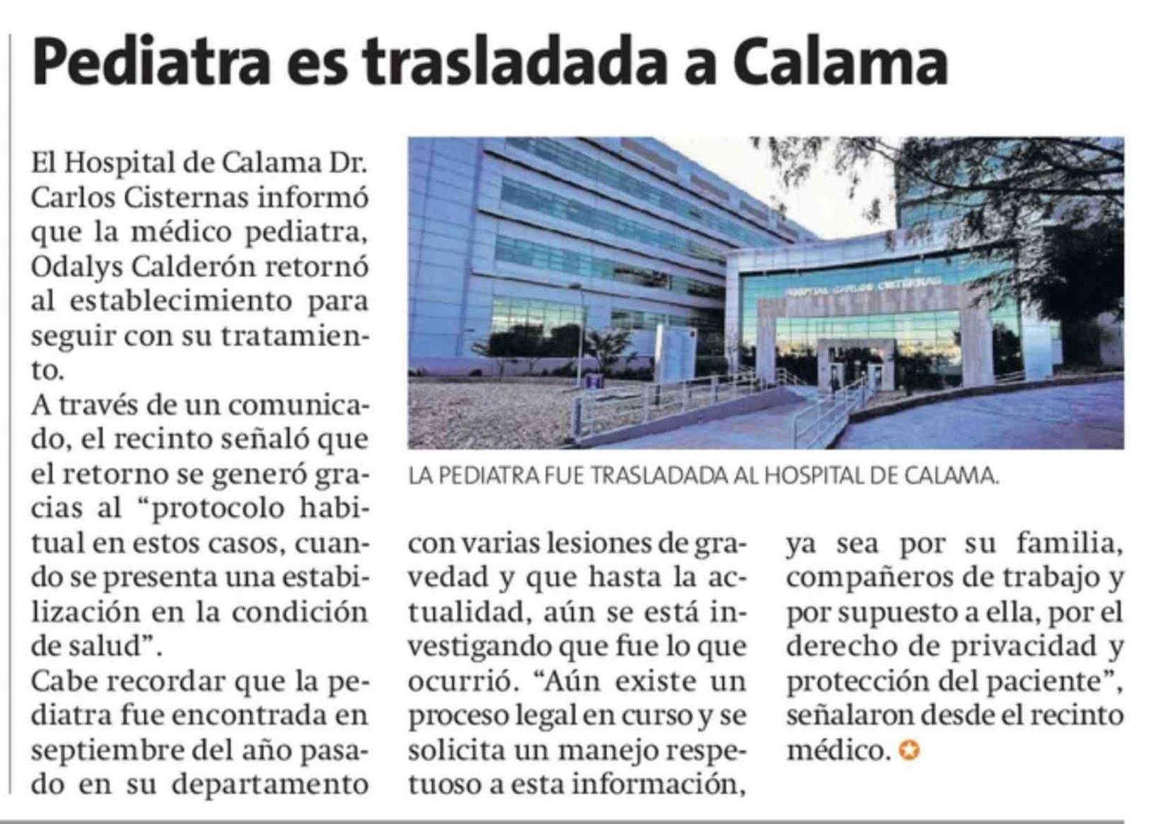 Pediatra es trasladada a Calama