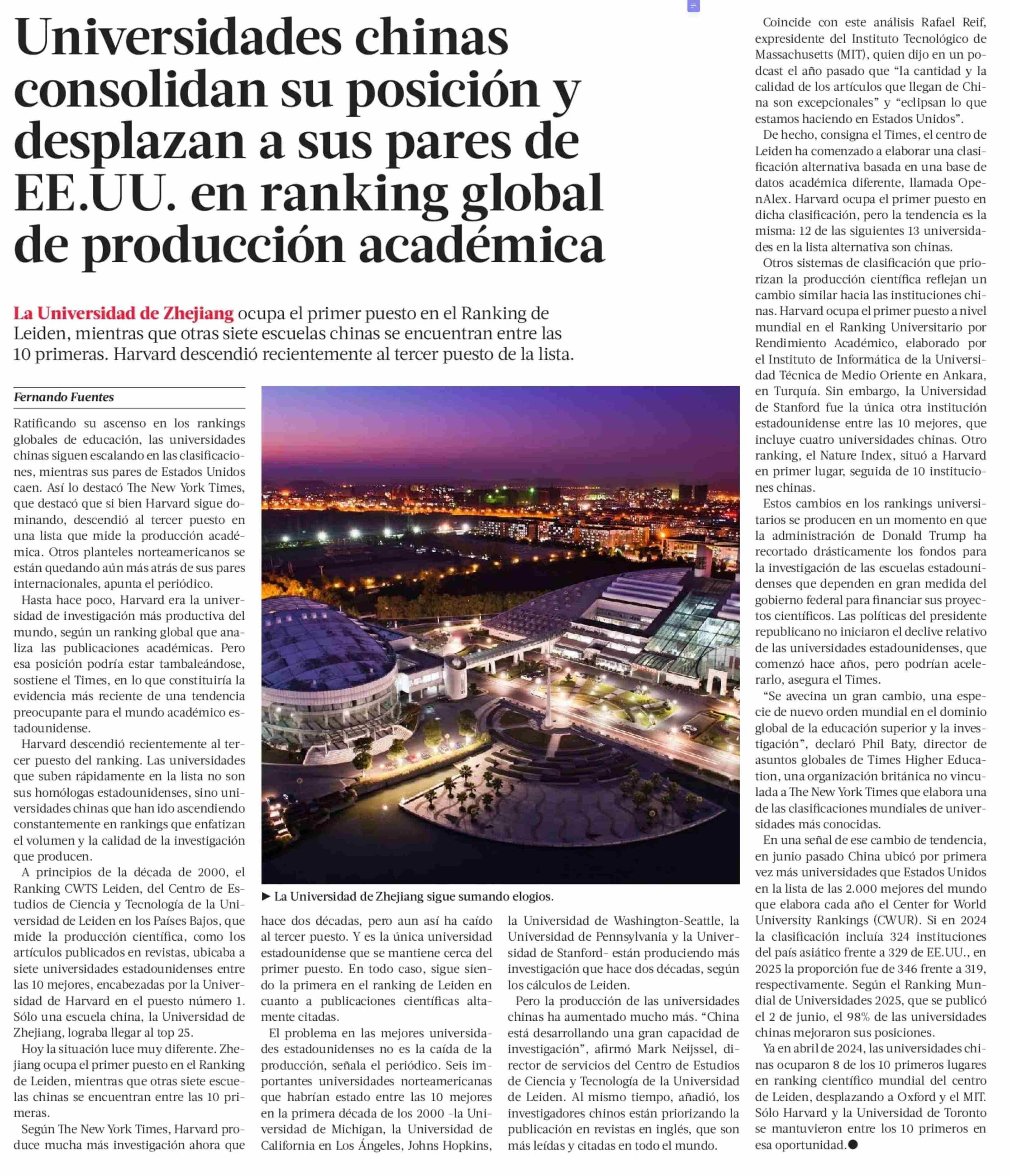 Universidades chinas consolidan su posición y desplazan a sus pares de EE.UU. en ranking global de producción académica