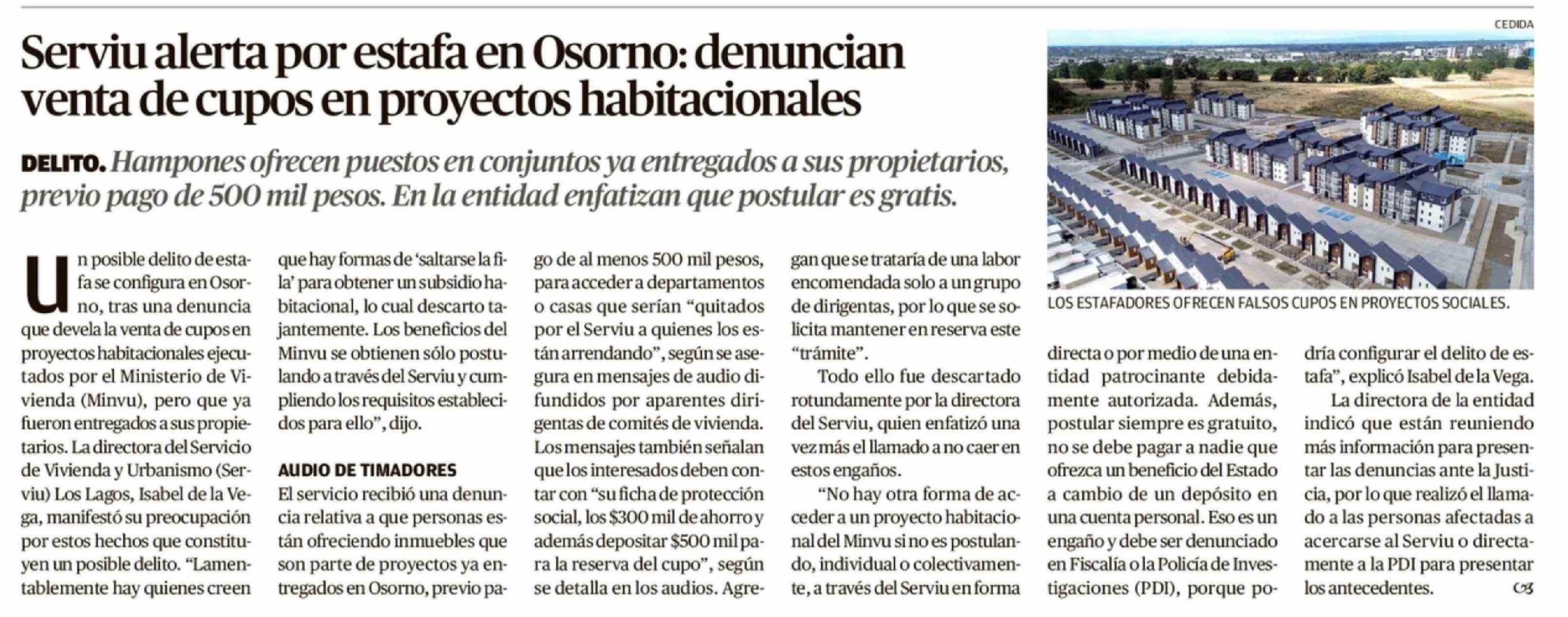 Serviu alerta por estafa en Osorno: denuncian venta de cupos en proyectos habitacionales