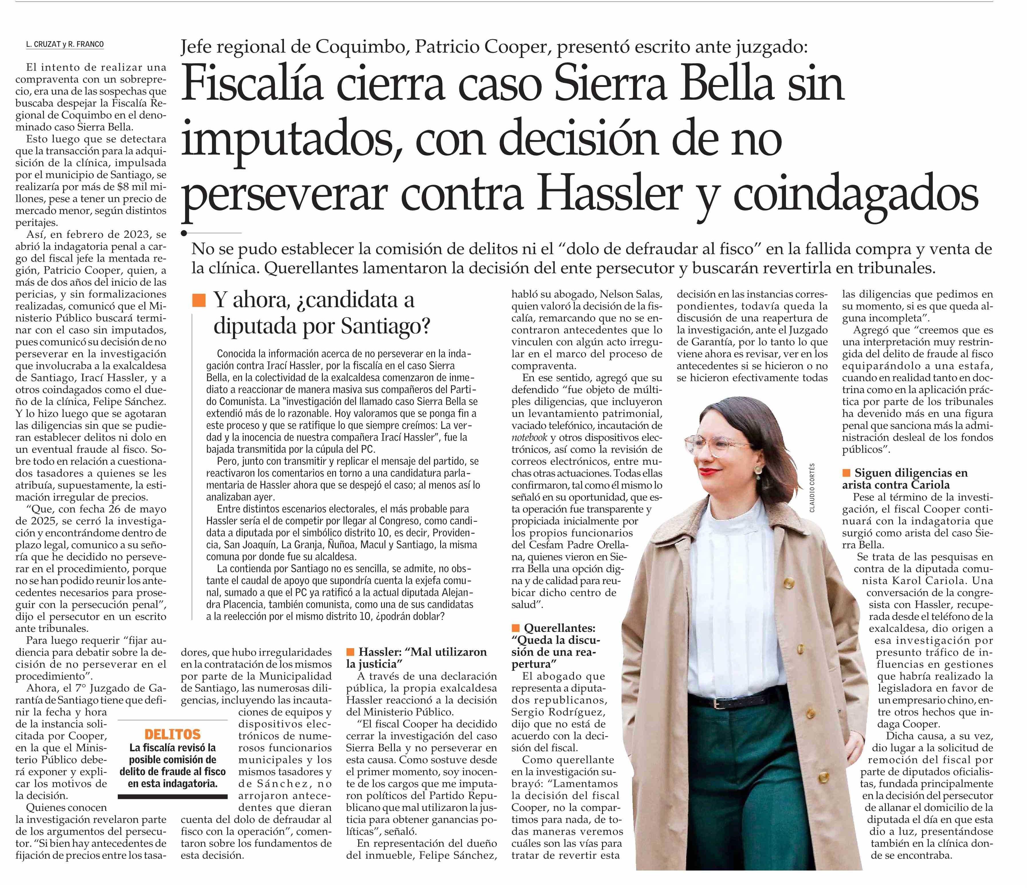 Fiscalía cierra caso Sierra Bella sin imputados, con decisión de no perseverar contra Hassler y coindagados