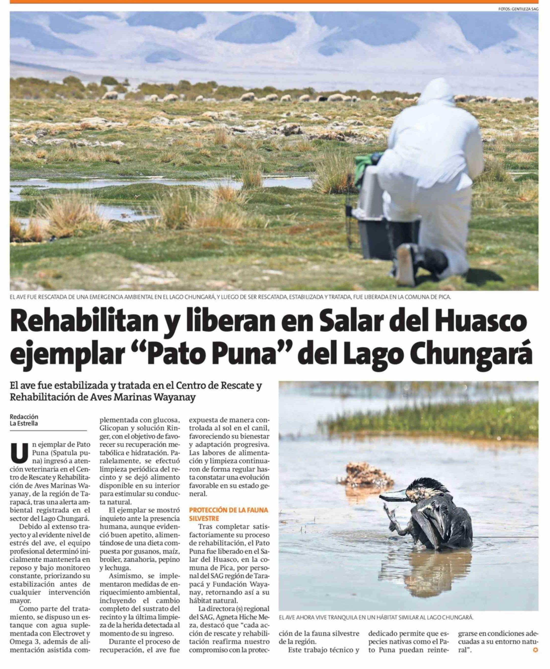 Rehabilitan y liberan en Salar del Huasco ejemplar "Pato Puna" del Lago Chungará