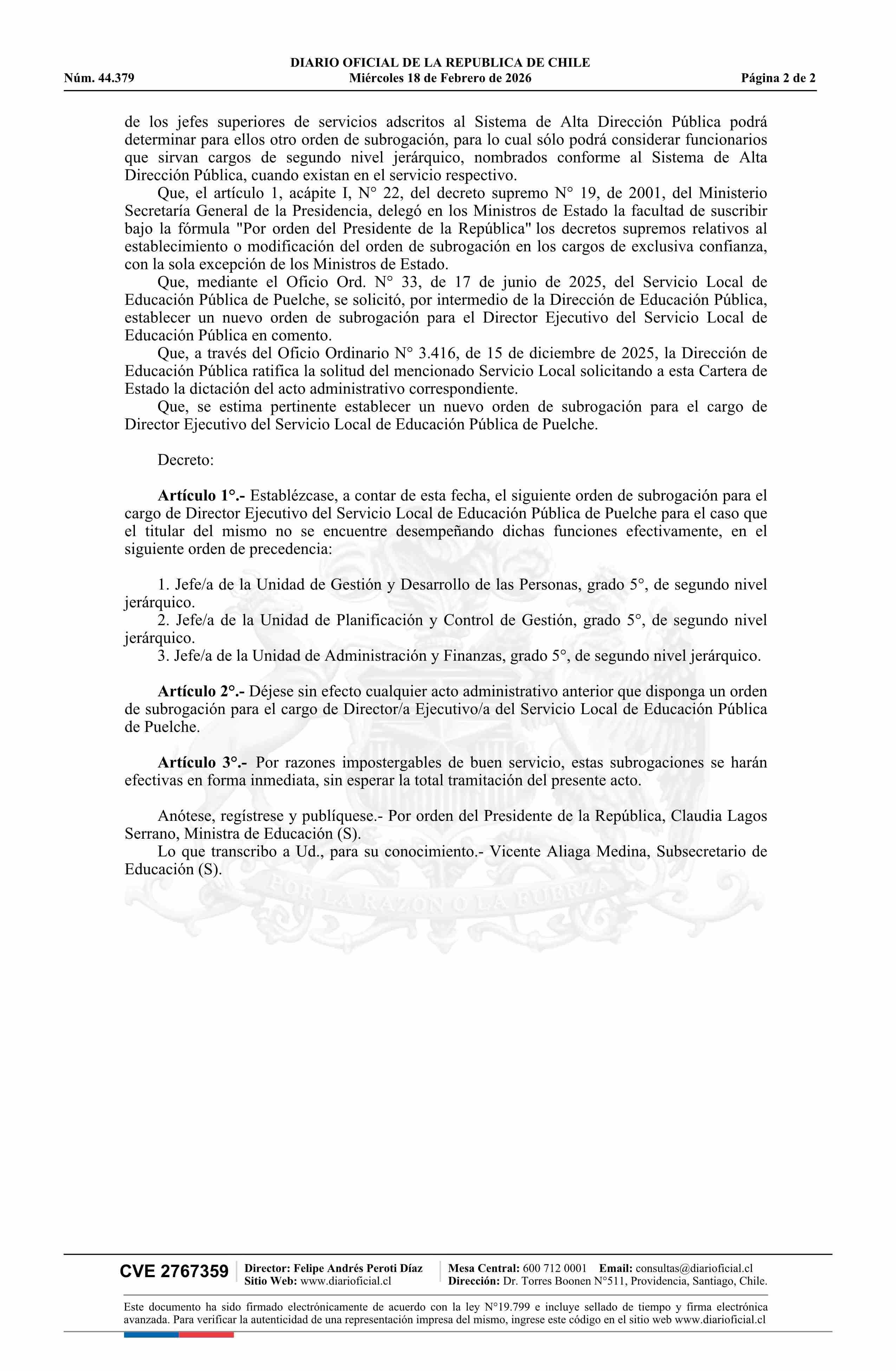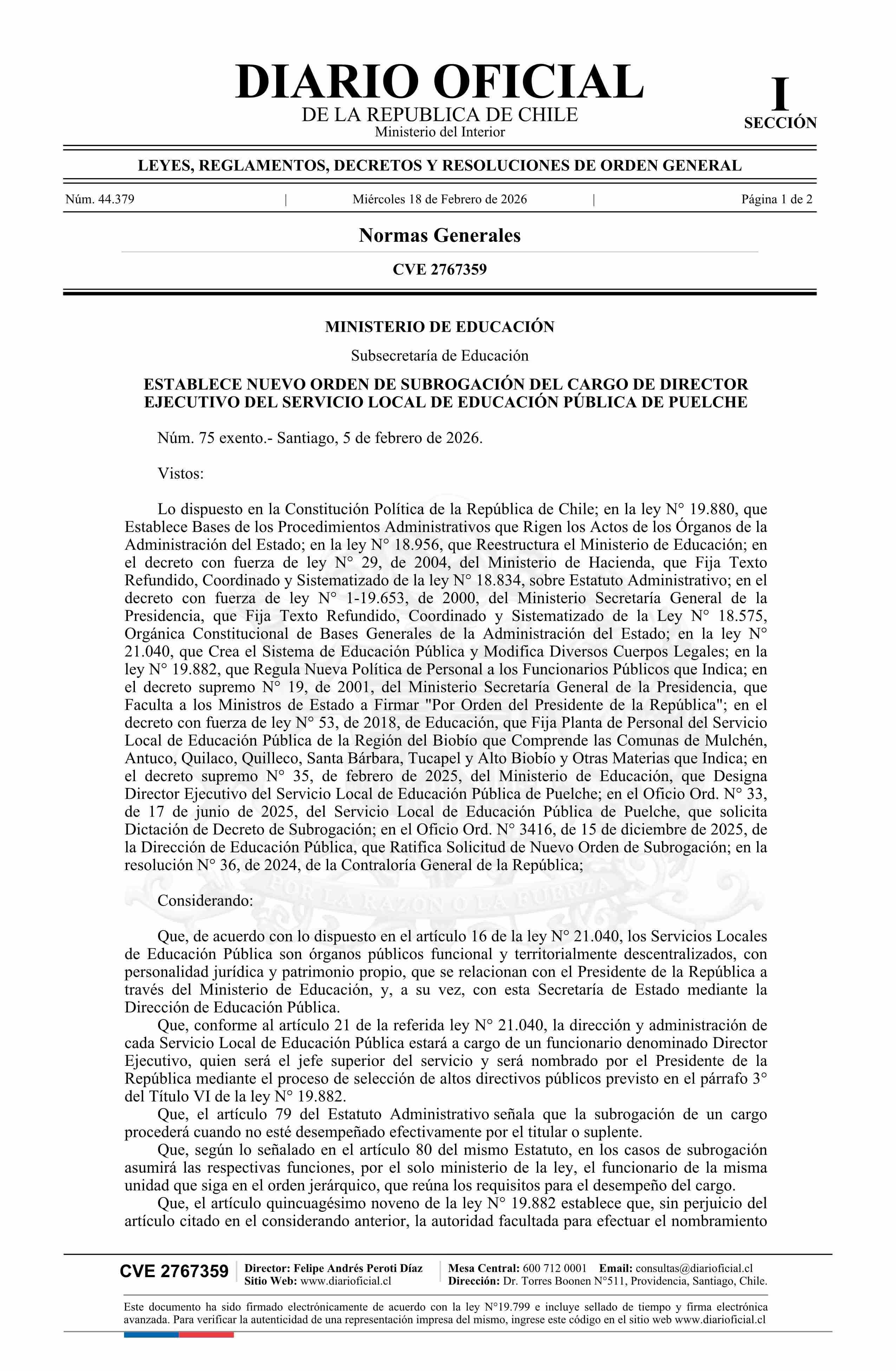 | Título: | Decreto exento número 75, de 2026.- Establece nuevo orden de subrogación del cargo de Director Ejecutivo del Servicio Local de Educación Pública de Puelche |