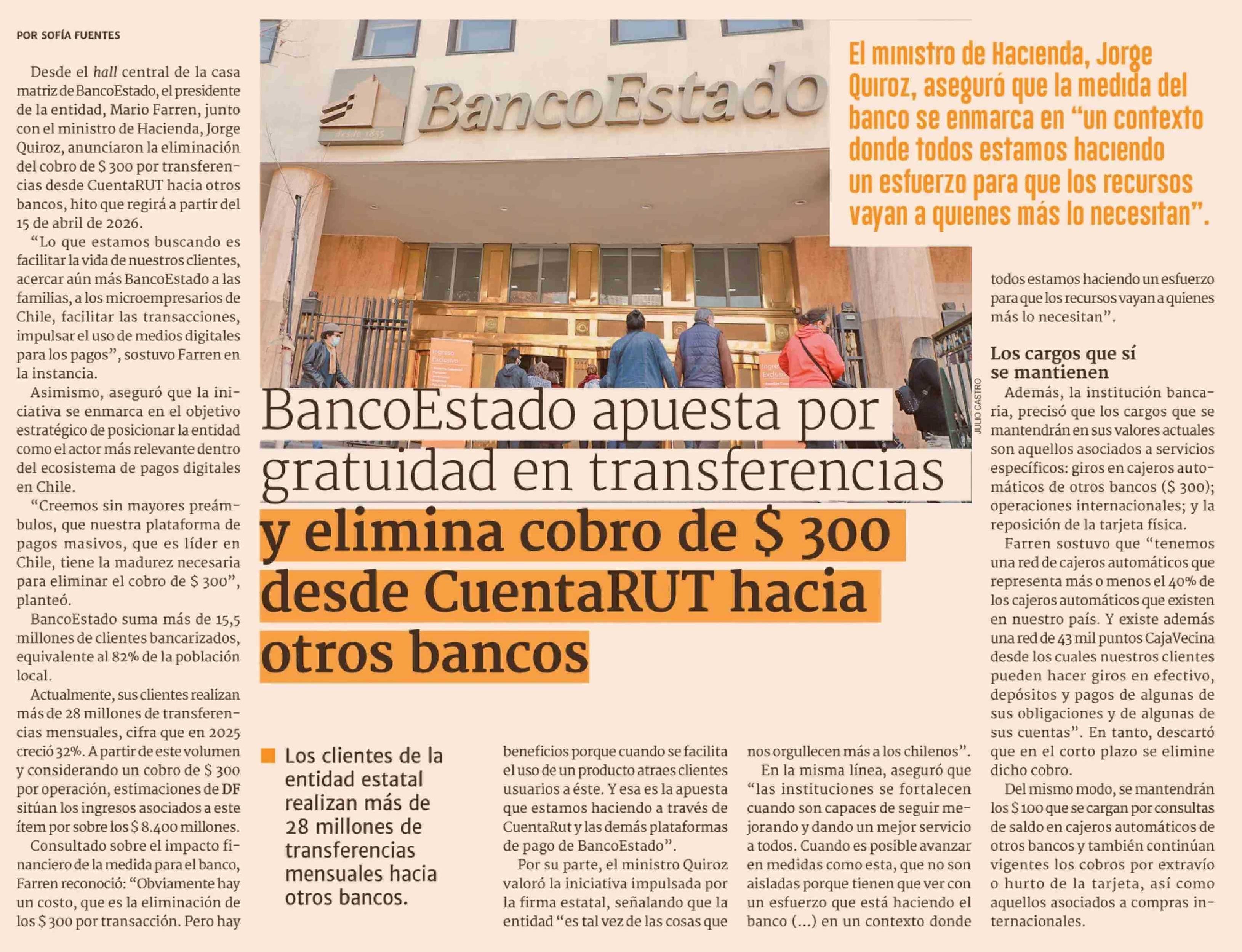 BancoEstado apuesta por gratuidad en transferencias y elimina cobro de $ 300 desde CuentaRUT hacia otros bancos