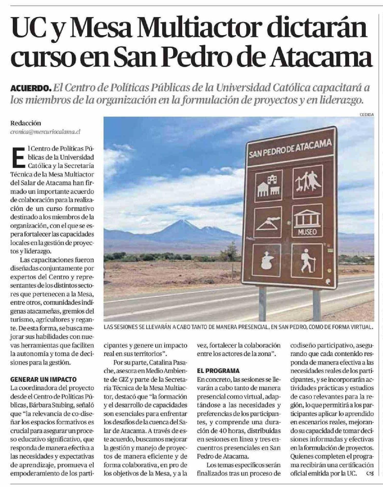 UC y Mesa Multiactor dictarán curso en San Pedro de Atacama