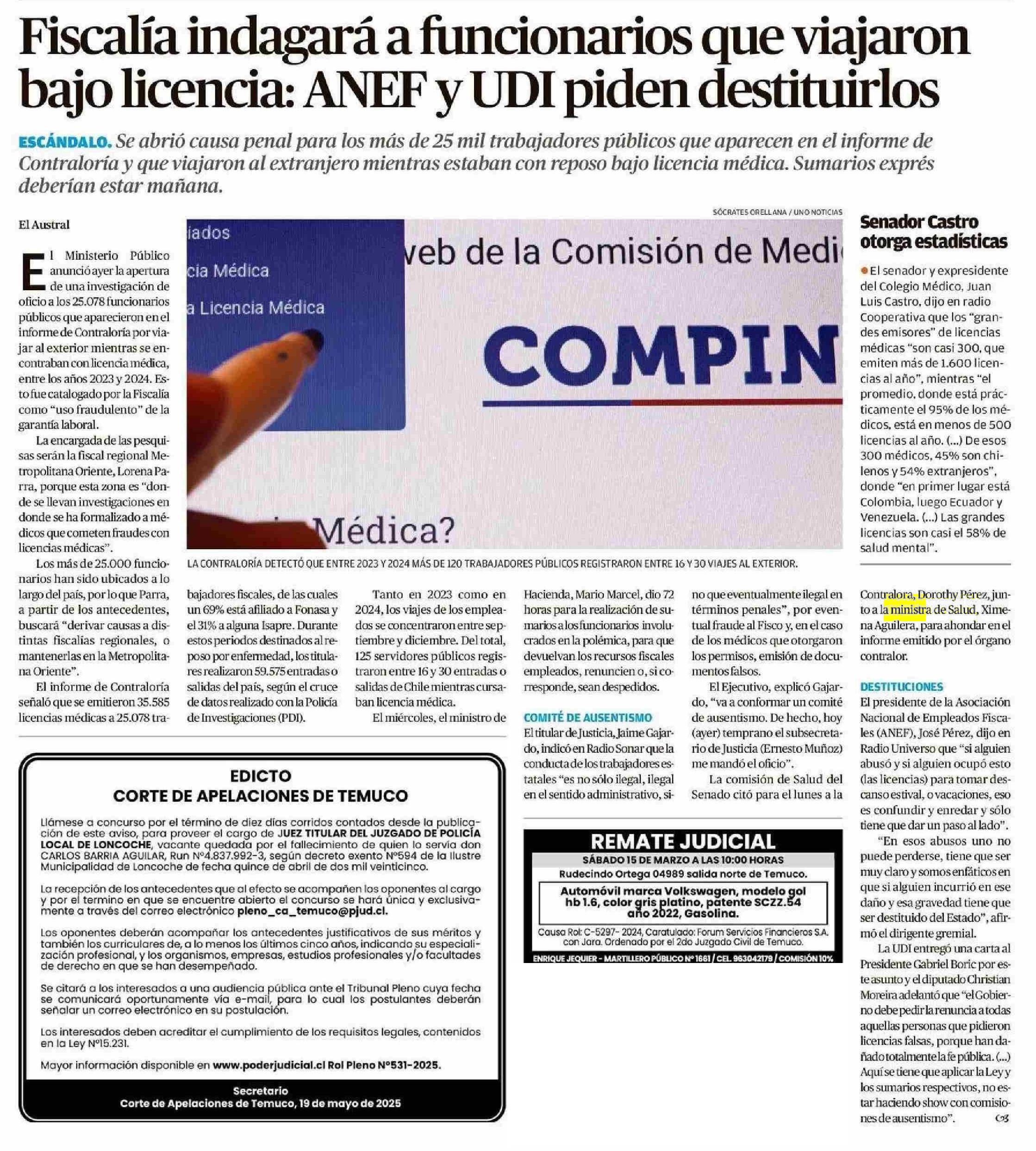 Título: Fiscalía indagará a funcionarios que viajaron bajo licencia: ANEF y UDI piden destituirlos