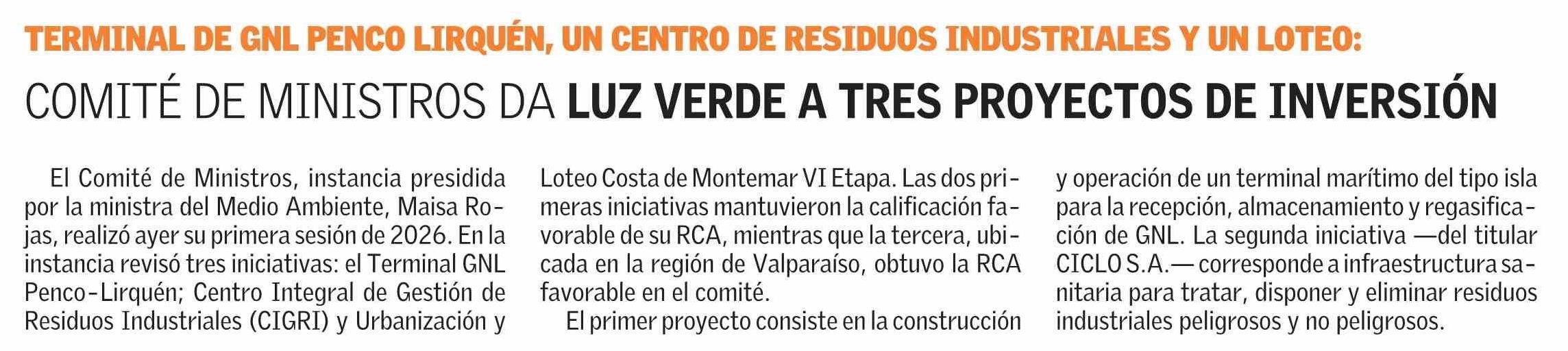 | Título: | TERMINAL DE GNL PENCO LIRQUÉN, UN CENTRO DE RESIDUOS INDUSTRIALES Y UN LOTEO: COMITÉ DE MINISTROS DA LUZ VERDE A TRES PROYECTOS DE INVERSIÓN |