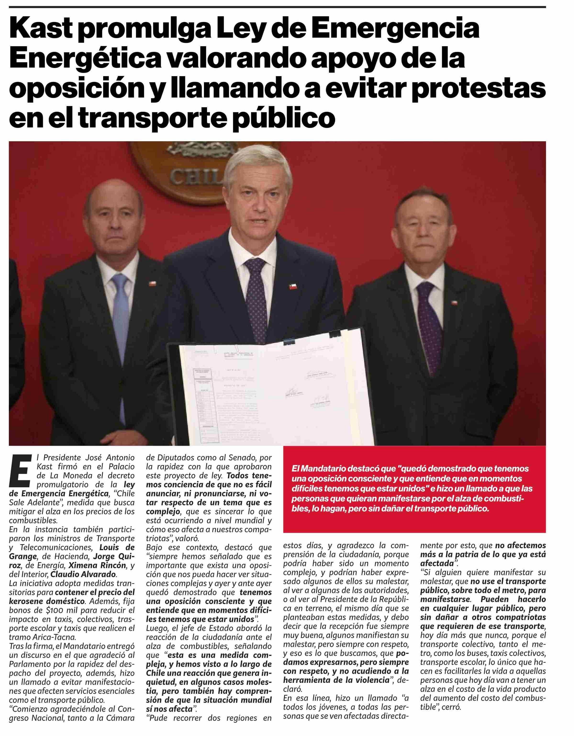 Kast promulga Ley de Emergencia Energética valorando apoyo de la oposición y llamando a evitar protestas en el transporte público