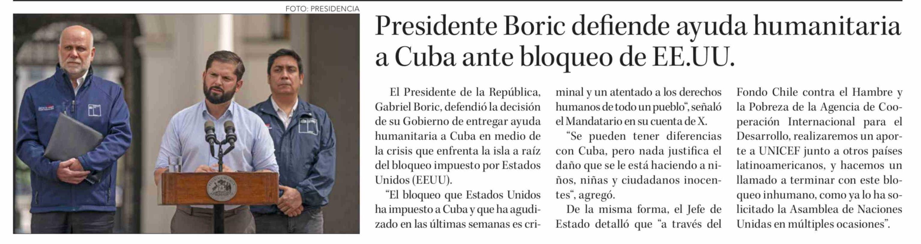 Presidente Boric defiende ayuda humanitaria a Cuba ante bloqueo de EE.UU.