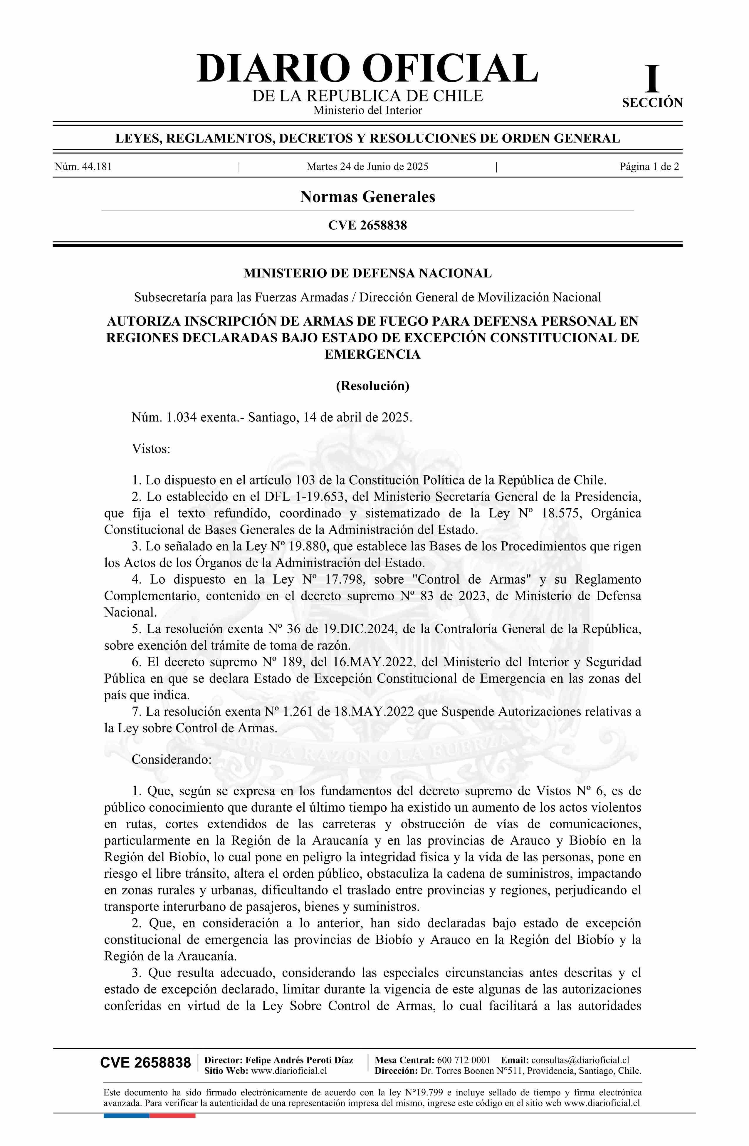 | Título: | Resolución exenta número 1.034, de 2025.- Autoriza inscripción de armas de fuego para defensa personal en regiones declaradas bajo estado de excepción constitucional de emergencia |
