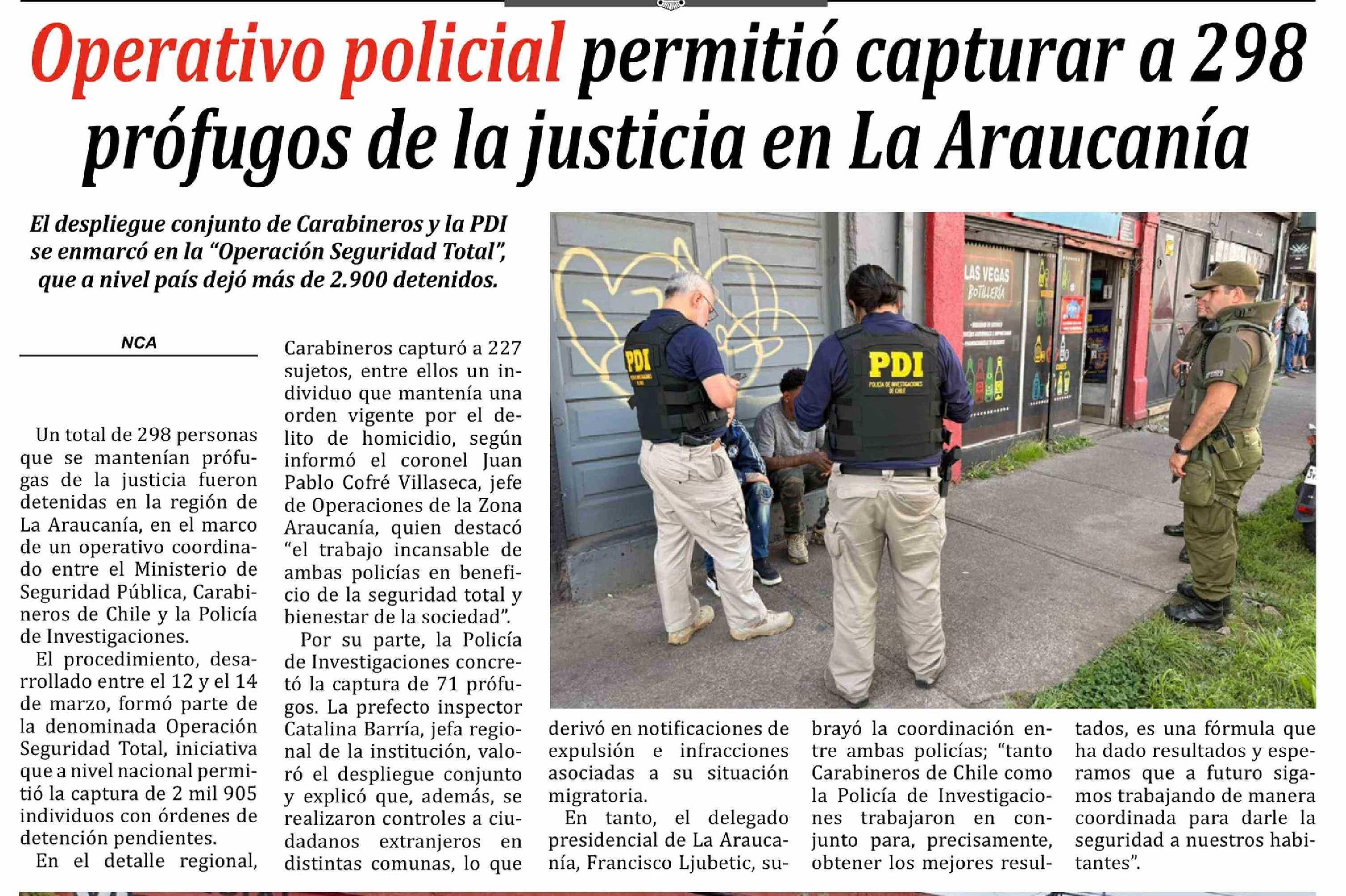 Operativo policial permitió capturar a 298 prófugos de la justicia en La Araucanía