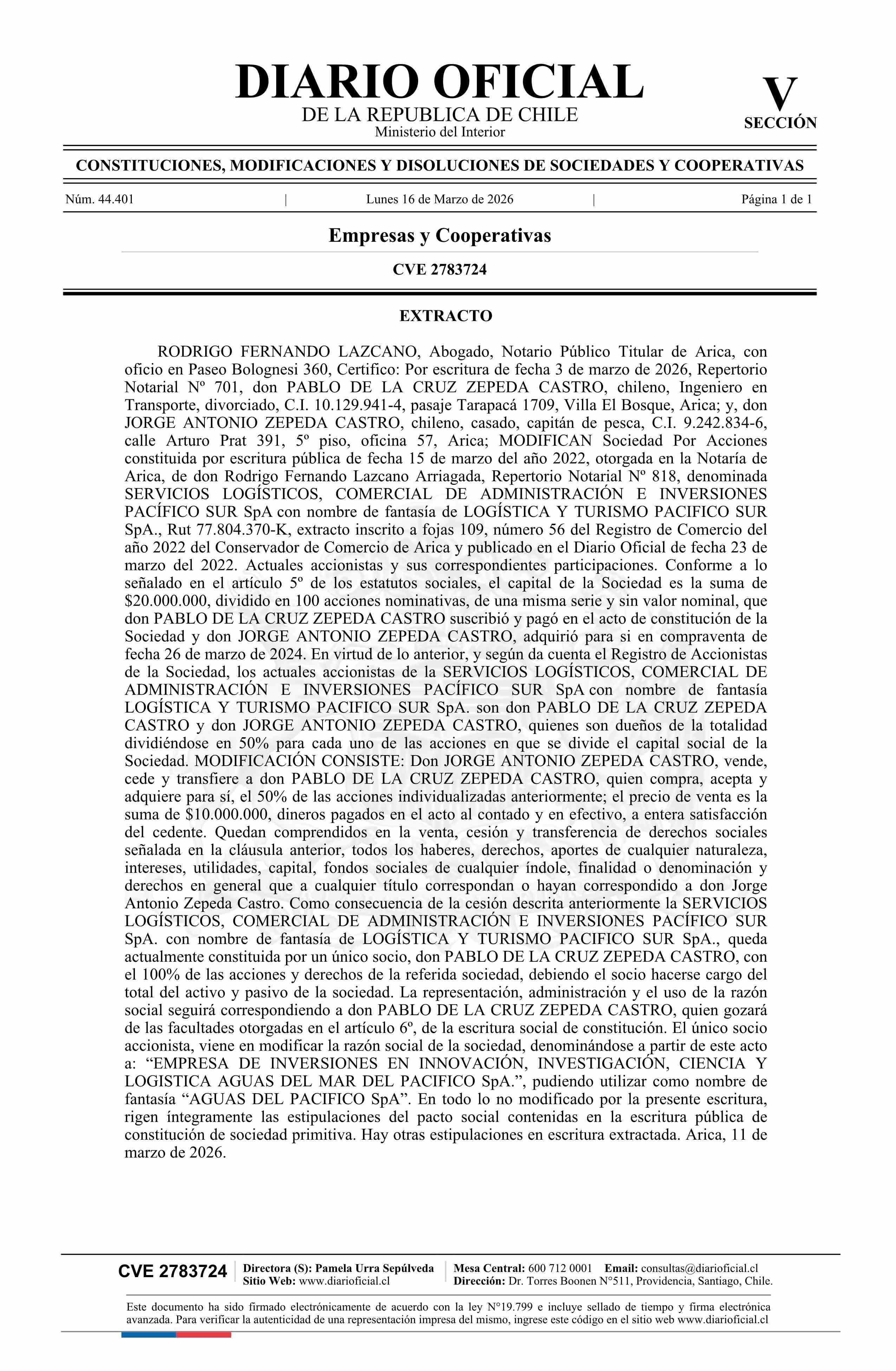 | Fuente: | Diario Oficial Edición Electrónica (Diario Oficial de Chile - 5 Empresas Y Cooper) | Página(s): | 105 |