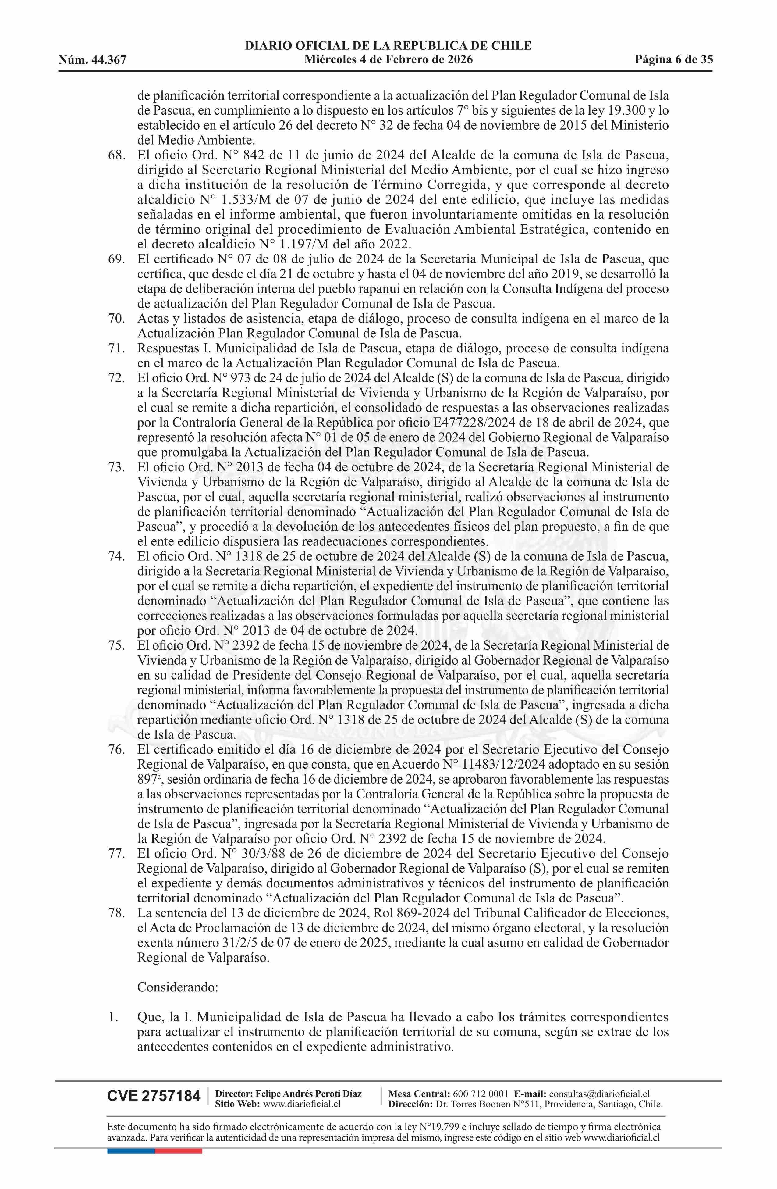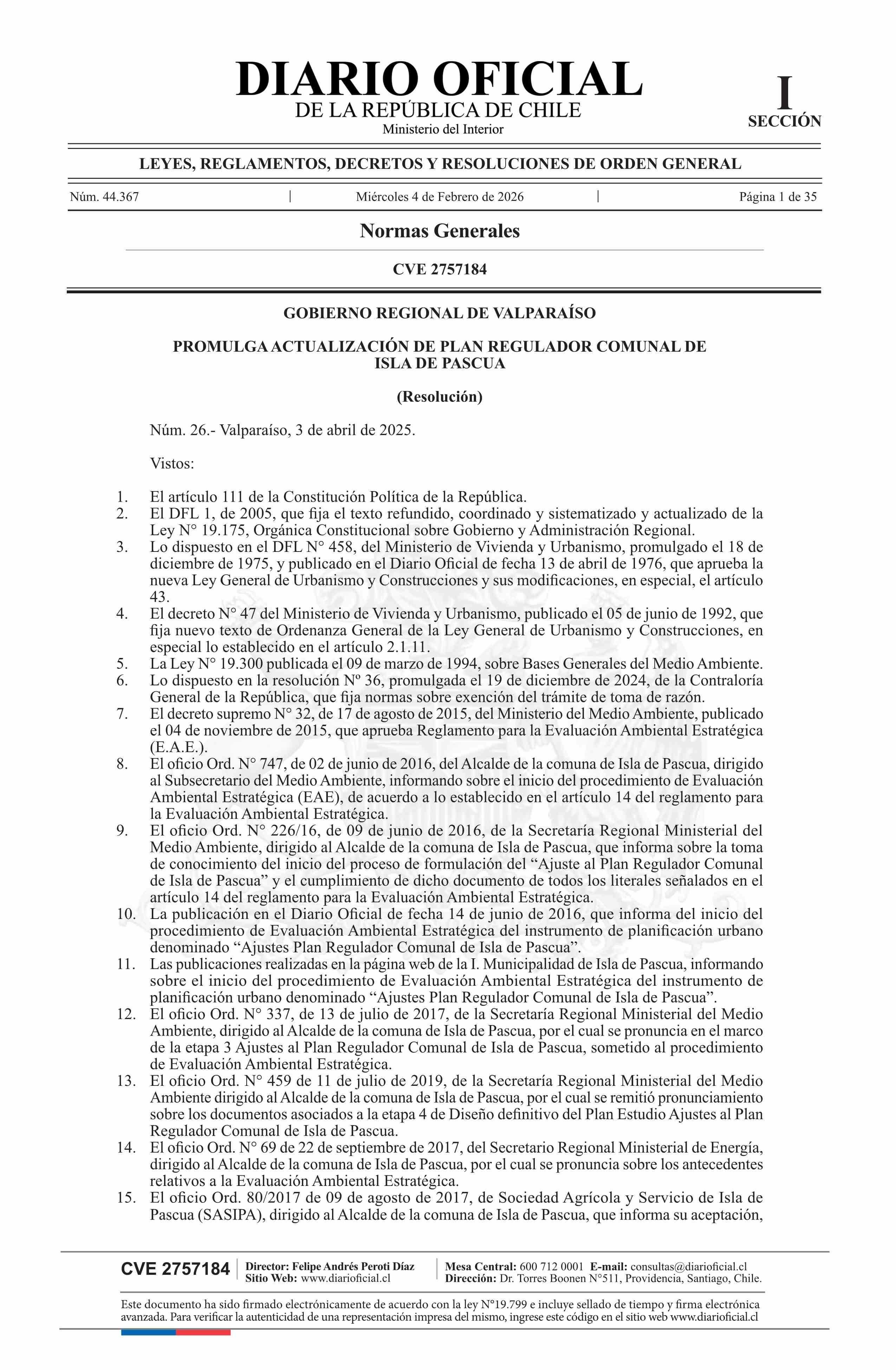 | Título: | Resolución número 26, de 2025.- Promulga actualización del Plan Regulador Comunal de Isla de Pascua |
