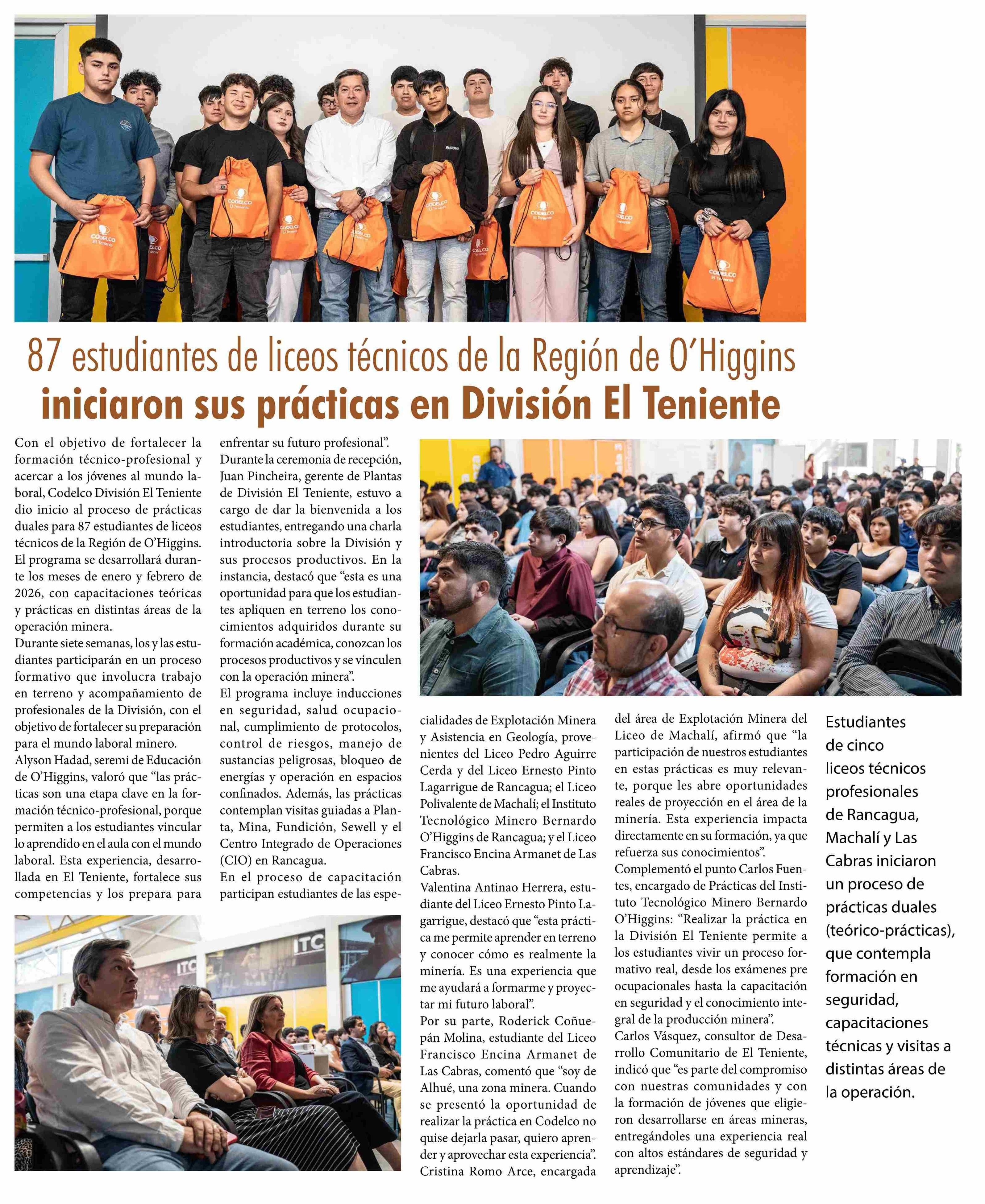 87 Estudiantes de liceos técnicos de la Región de O'Higgins iniciaron sus prácticas en División El Teniente