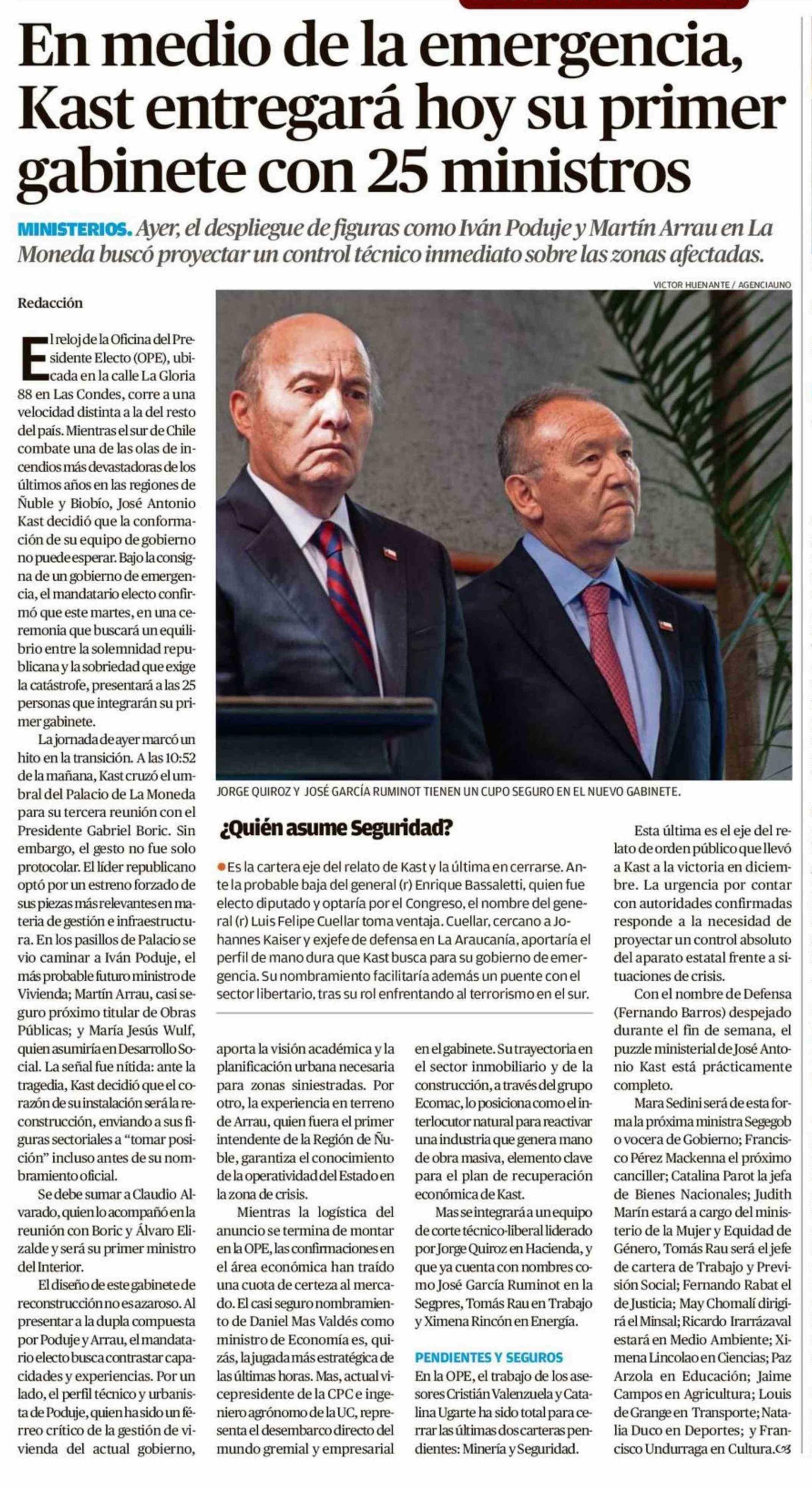 En medio de la emergencia, Kast entregará hoy su primer gabinete con 25 ministros