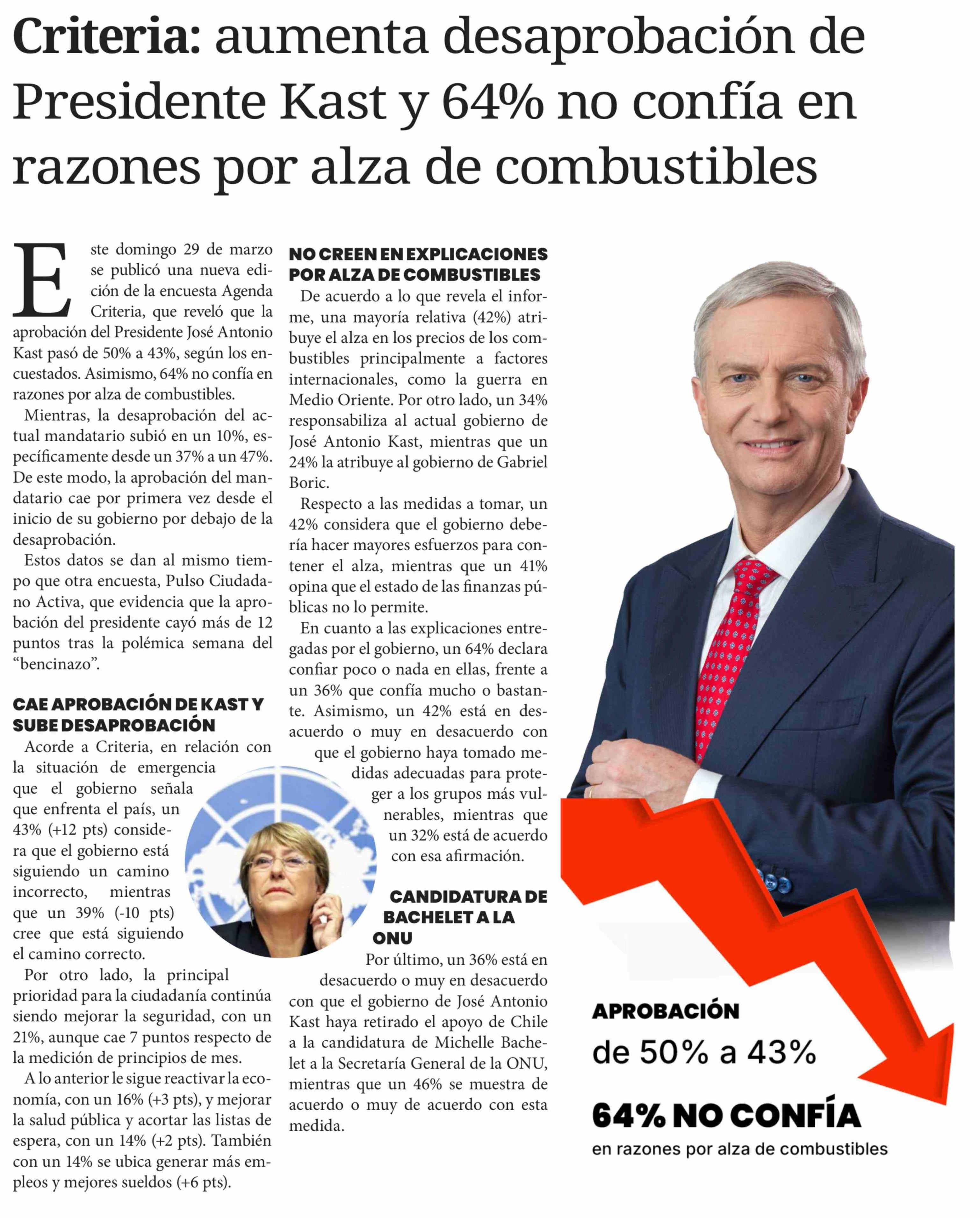 Título: Criteria: aumenta desaprobación de Presidente Kast y 64% no confía en razones por alza de combustibles
