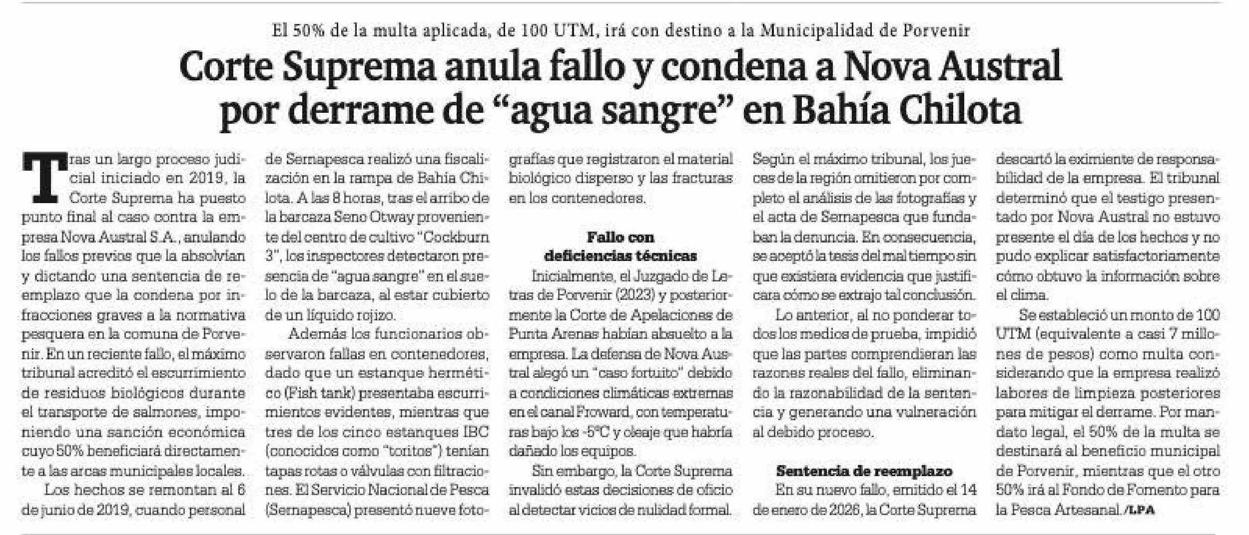 Corte Suprema anula fallo y condena a Nova Austral por derrame de "agua sangre" en Bahía Chilota
