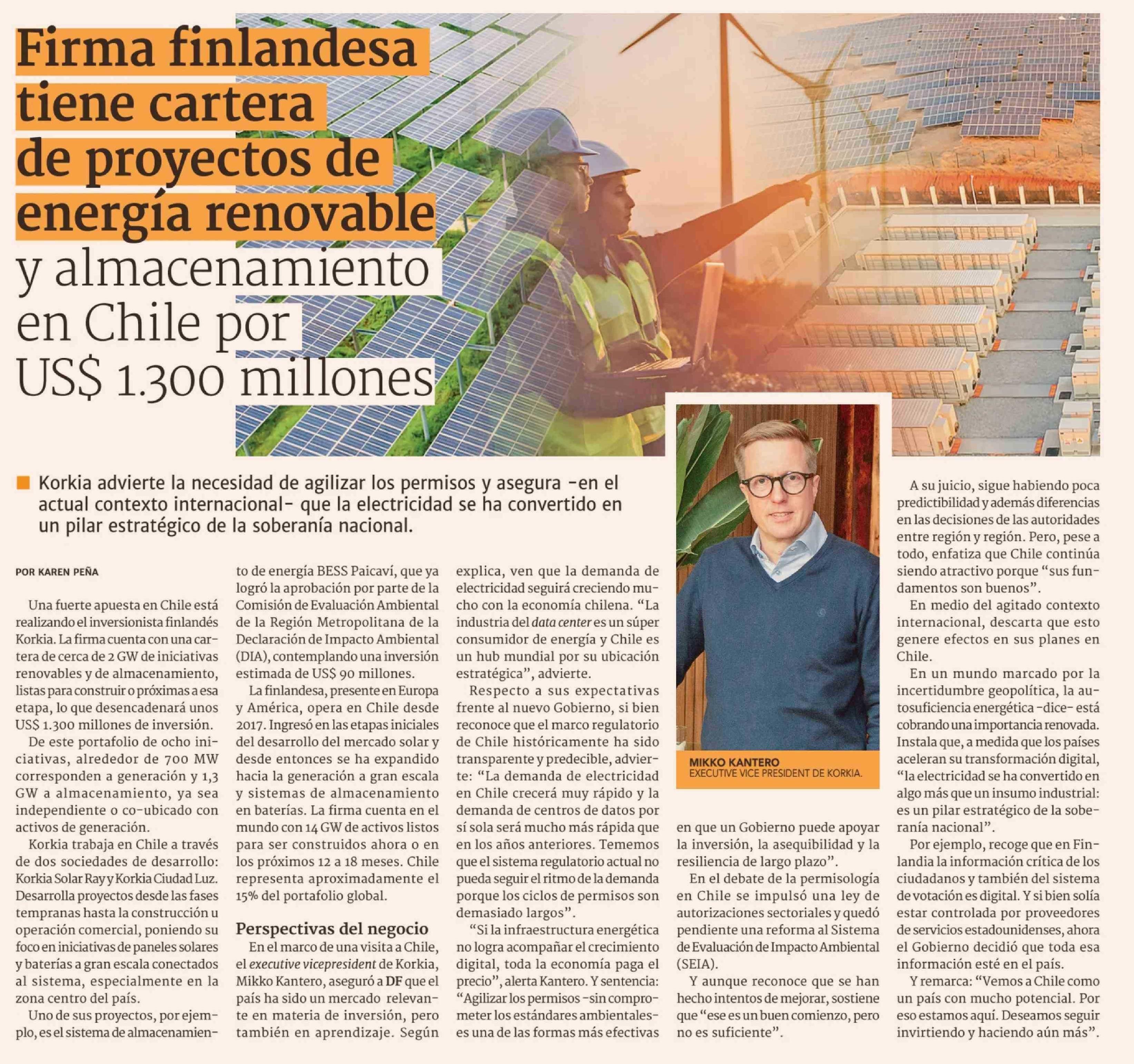 Firma finlandesa tiene cartera de proyectos de energía renovable y almacenamiento en Chile por US$ 1.300 millones