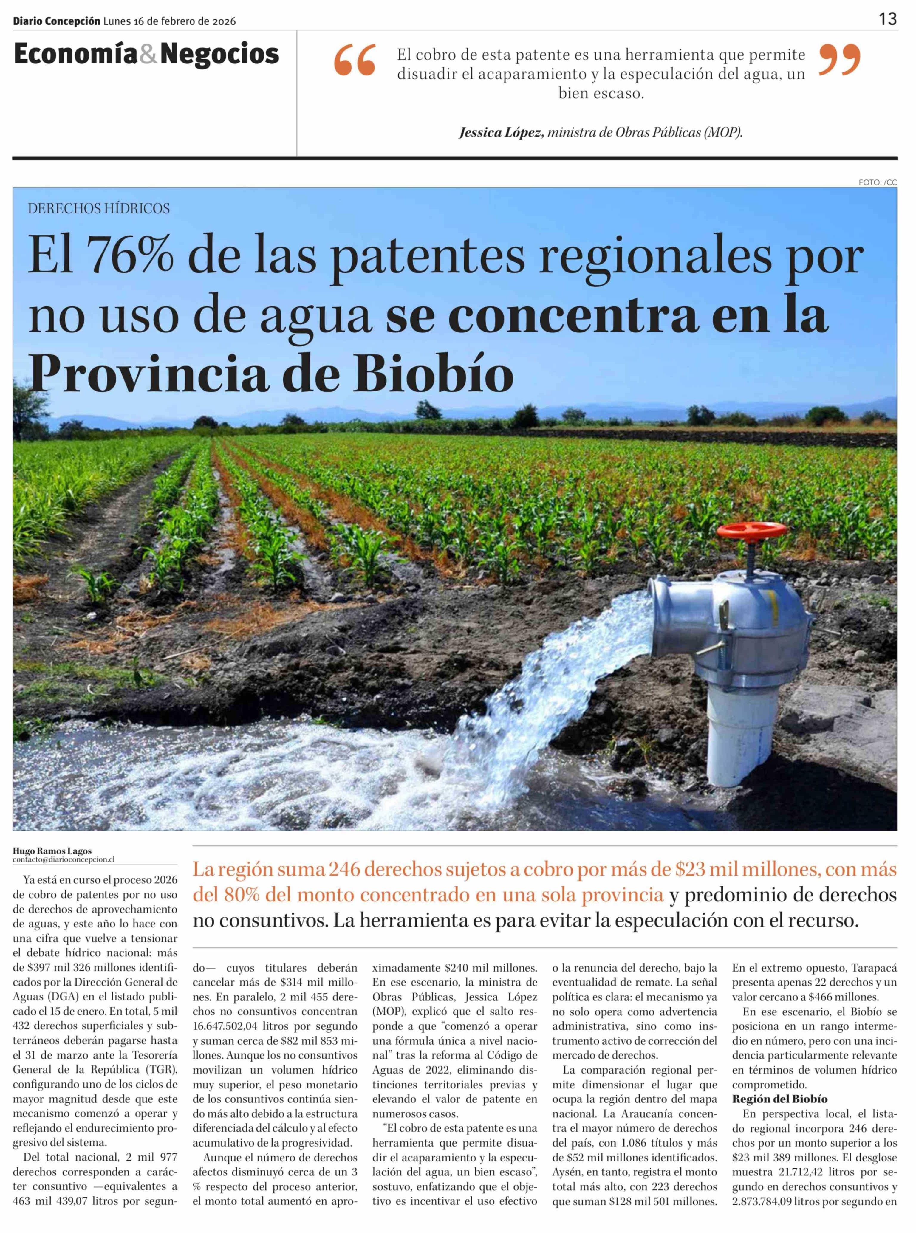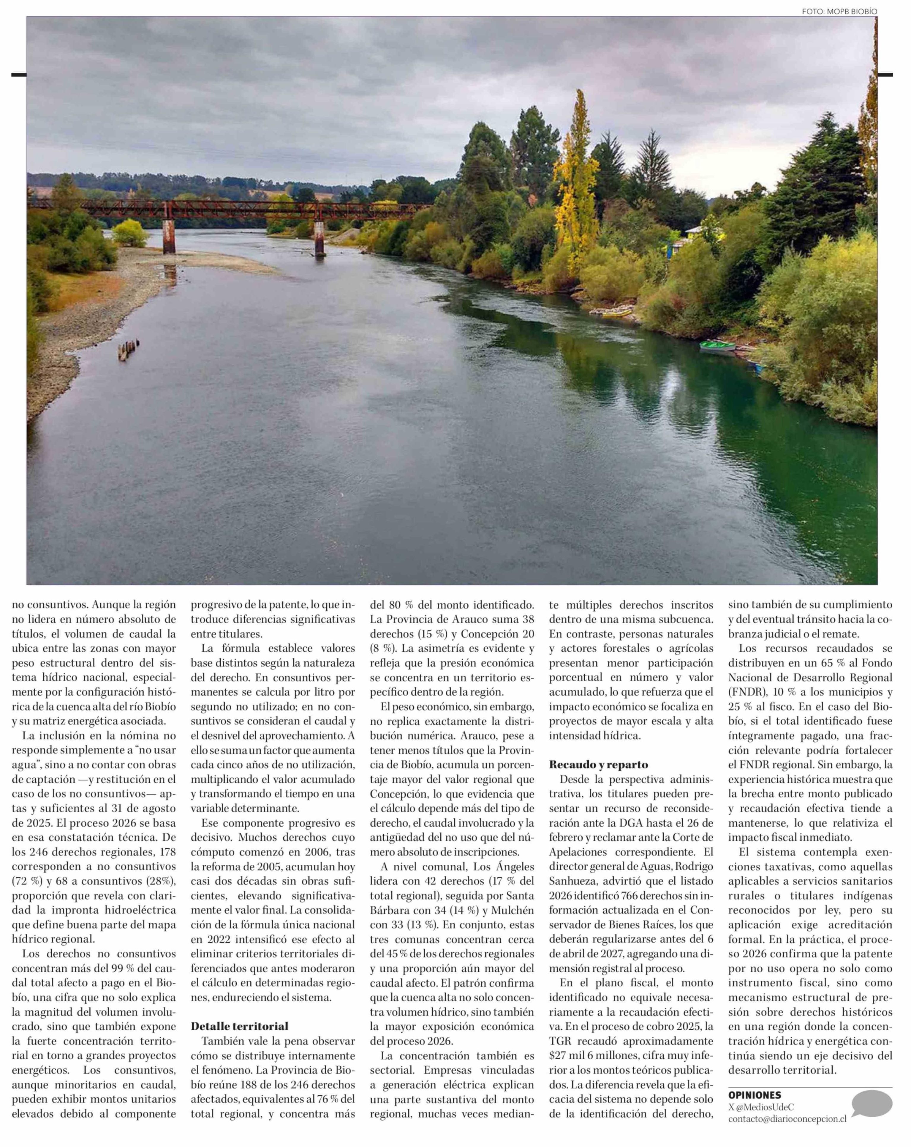 El 76% de las patentes regionales por no uso de agua se concentra en la Provincia de Biobío