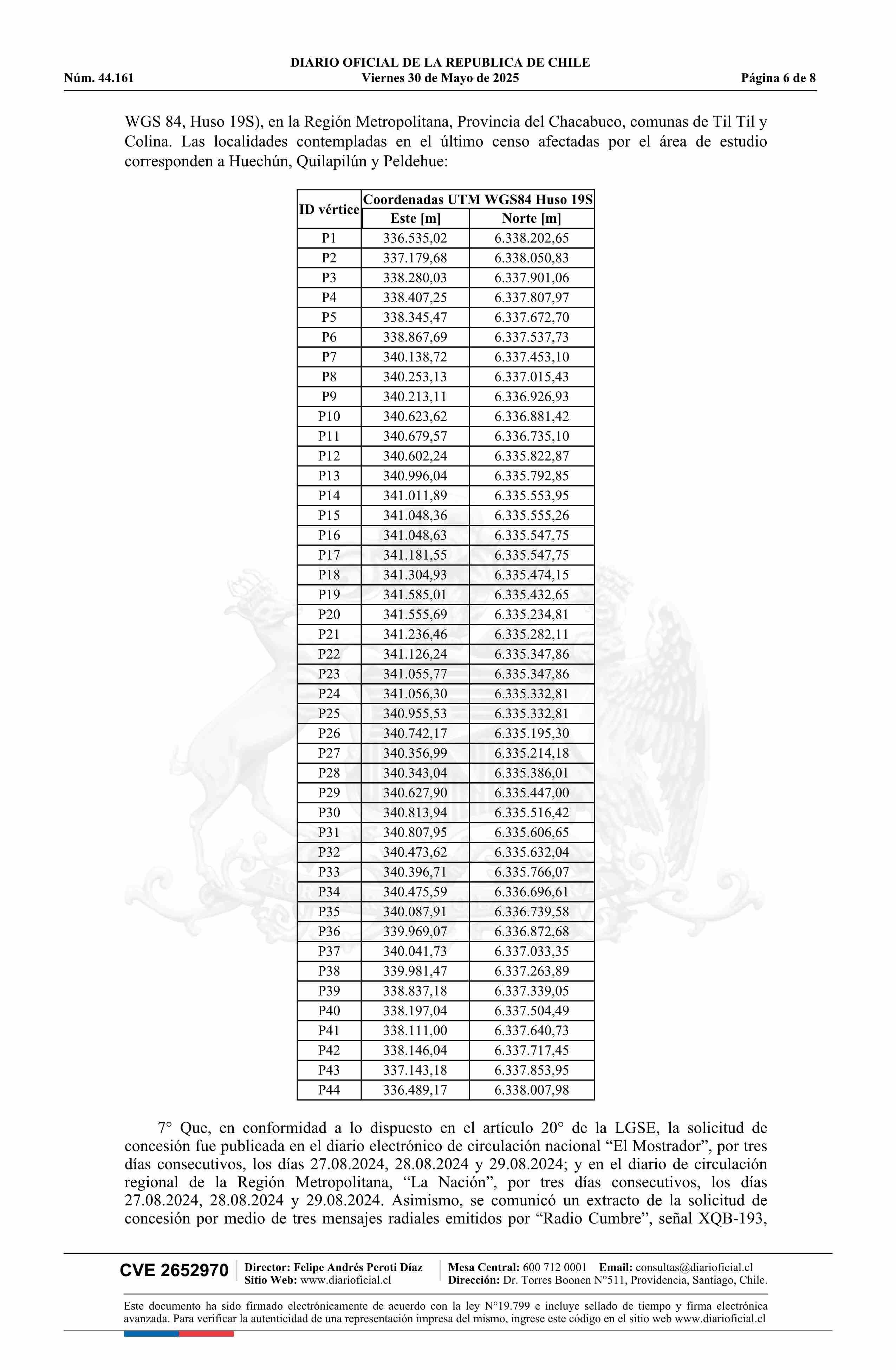 | Título: | Resolución exenta número 31.240, de 2025.- Otorga a Biwo Renovables S.A. concesión provisional para proyecto de transmisión de energía eléctrica denominado Línea de Transmisión 1x220 kV Volcán Colachi, Subestación Seccionadora Los Maitenes y Seccionamientos |