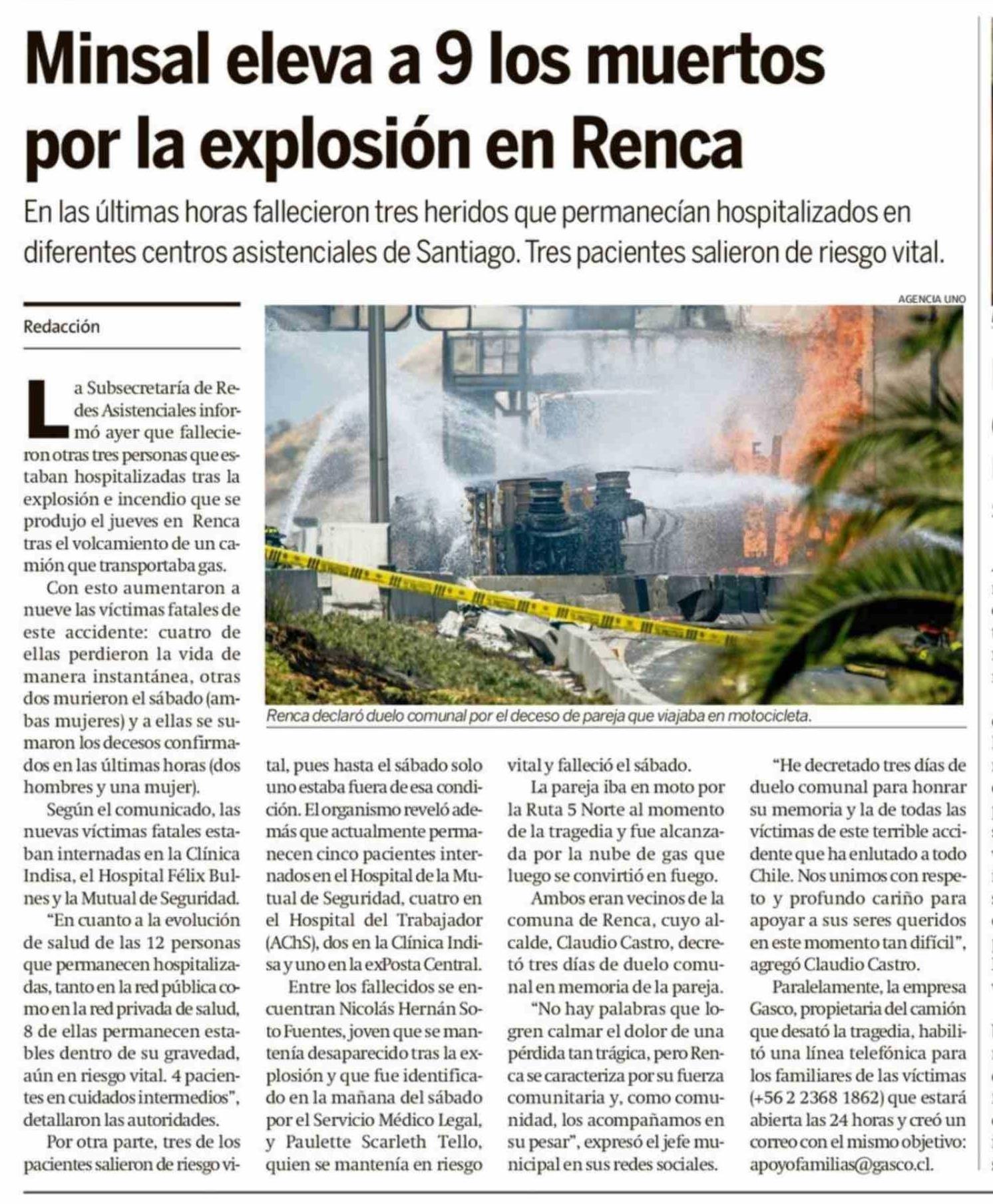 Minsal eleva a 9 los muertos por la explosión en Renca