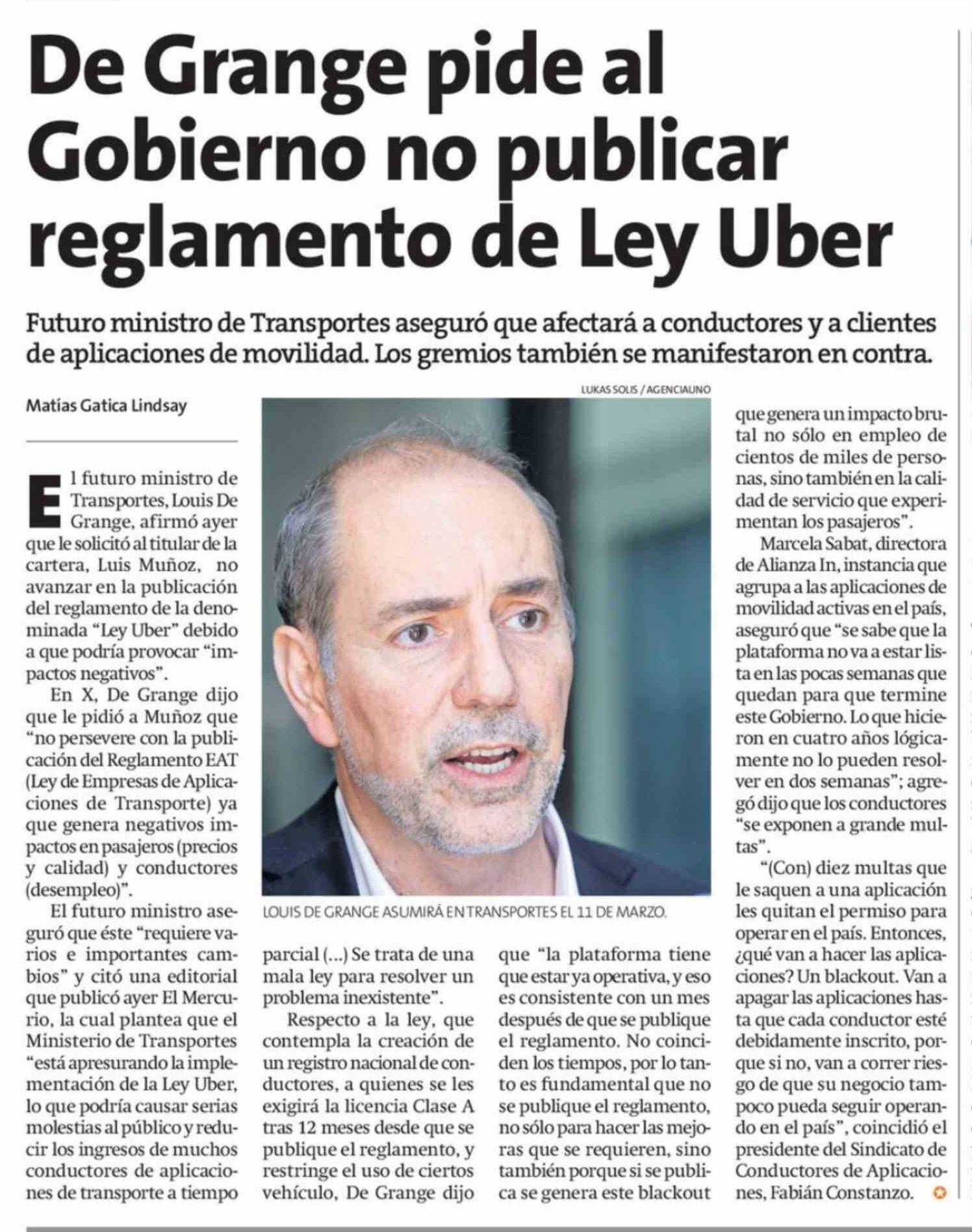 De Grange pide al Gobierno no publicar reglamento de Ley Uber