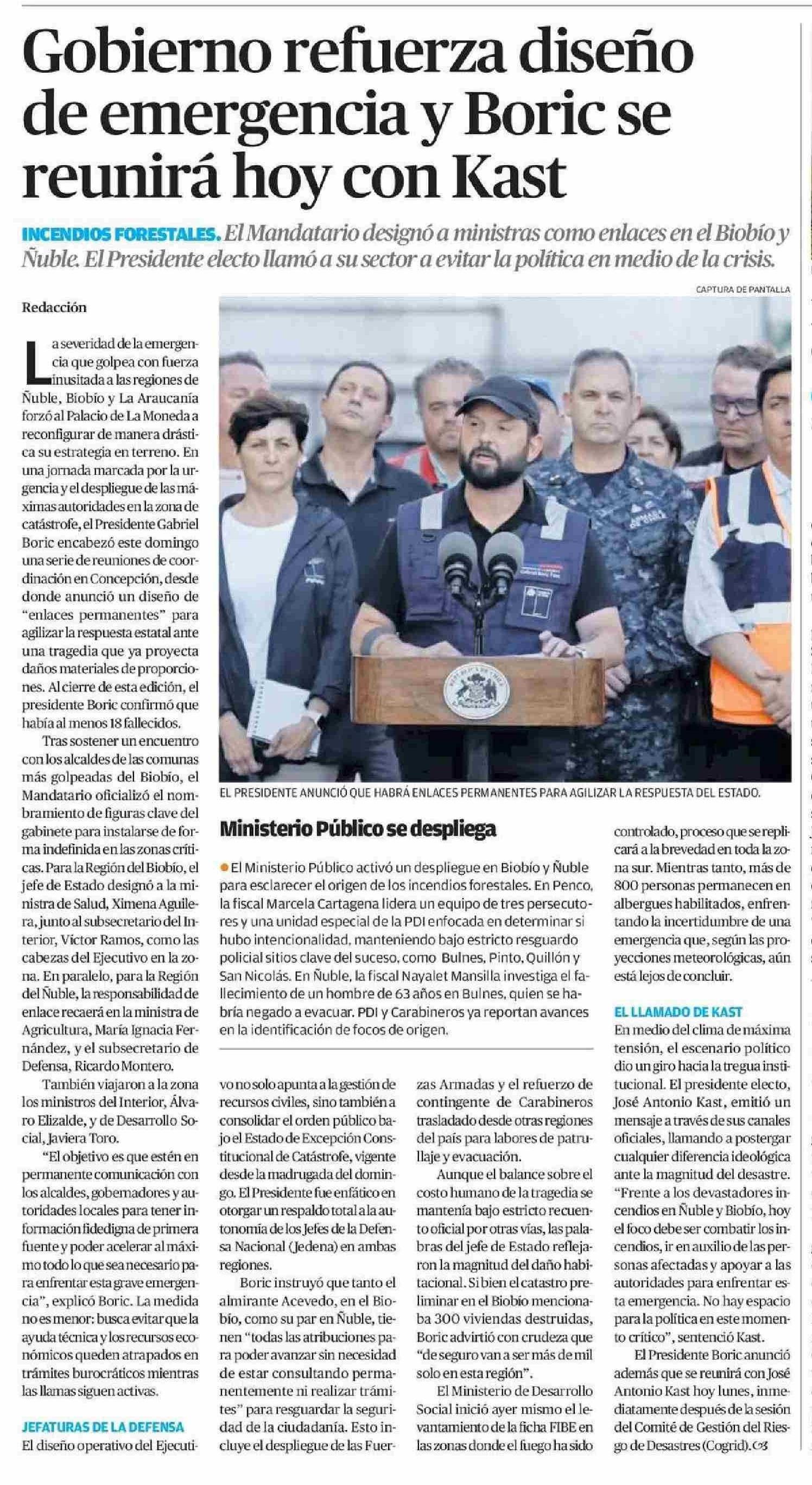 Gobierno refuerza diseño de emergencia y Boric se reunirá hoy con Kast