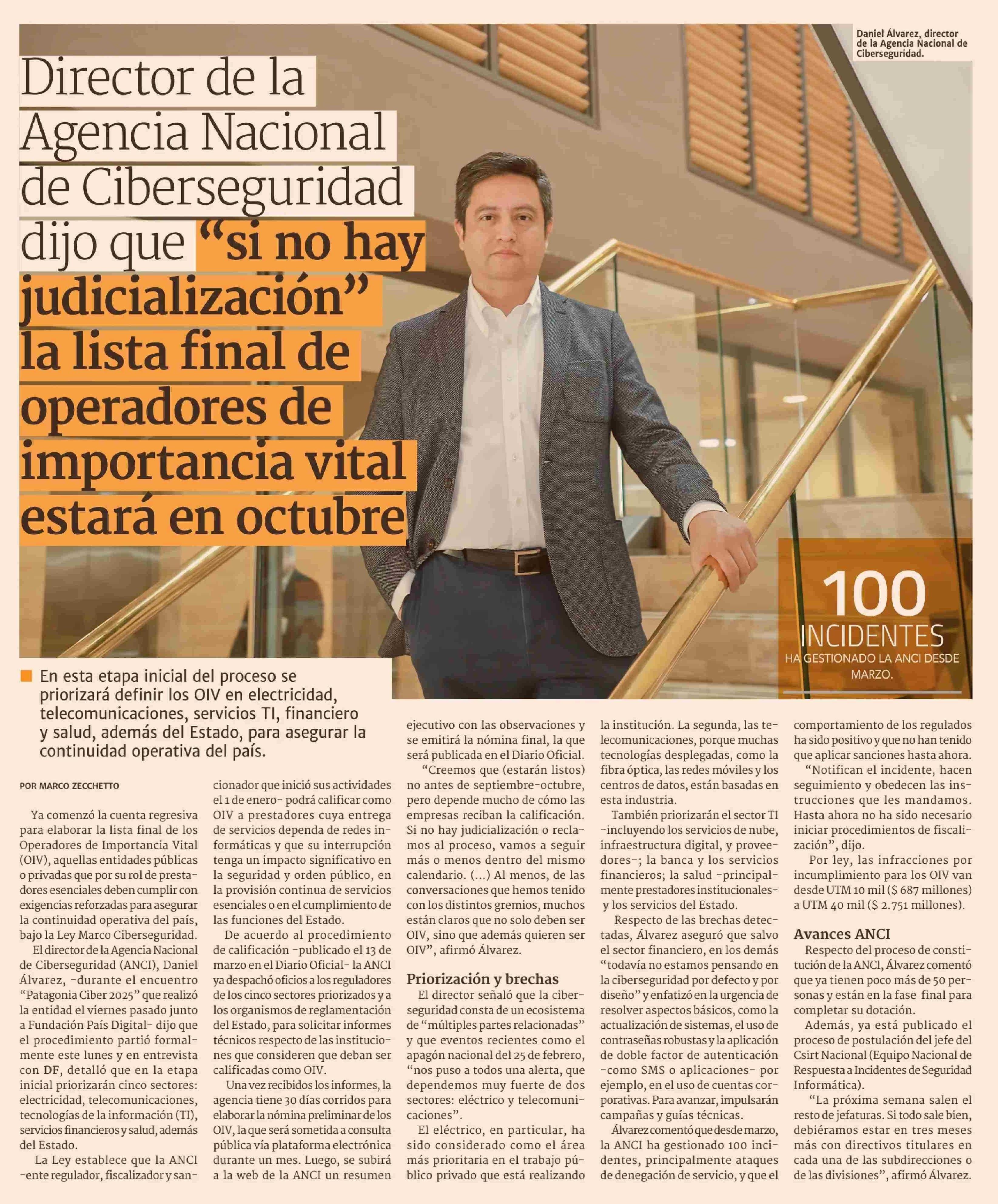 | Título: | Director de la Agencia Nacional de Ciberseguridad dijo que "si no hay judicialización” la lista final de operadores de importancia vital estará en octubre |