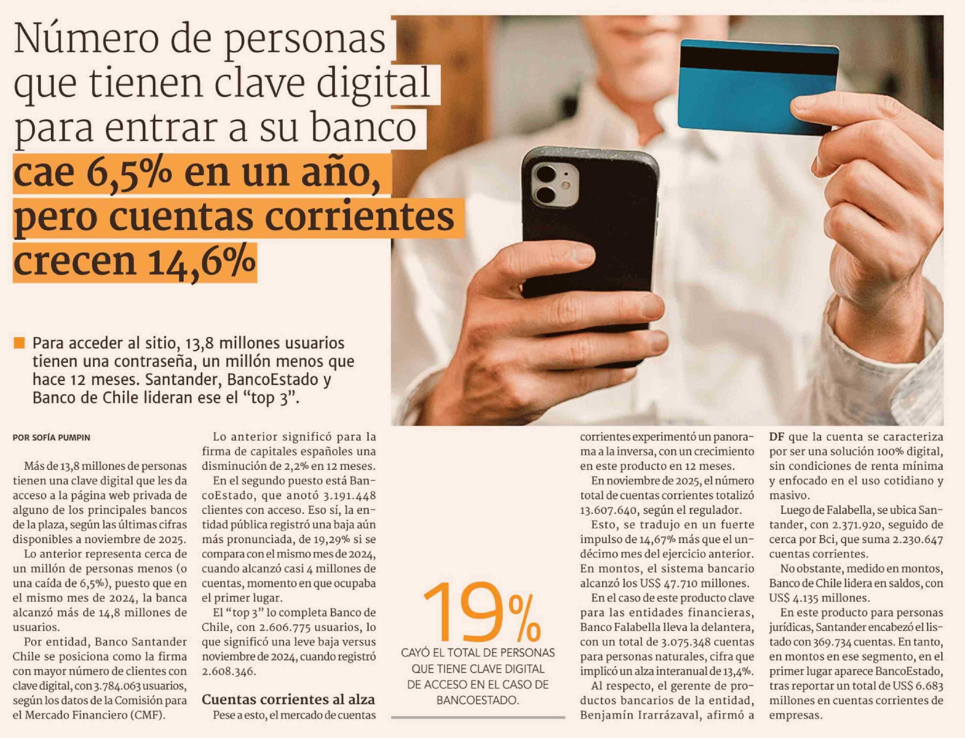 | Título: | Número de personas que tienen clave digital para entrar a su banco Número de personas que tienen clave digital para entrar a su banco cae 6,5% en un año, pero cuentas corrientes crecen 14,6% |