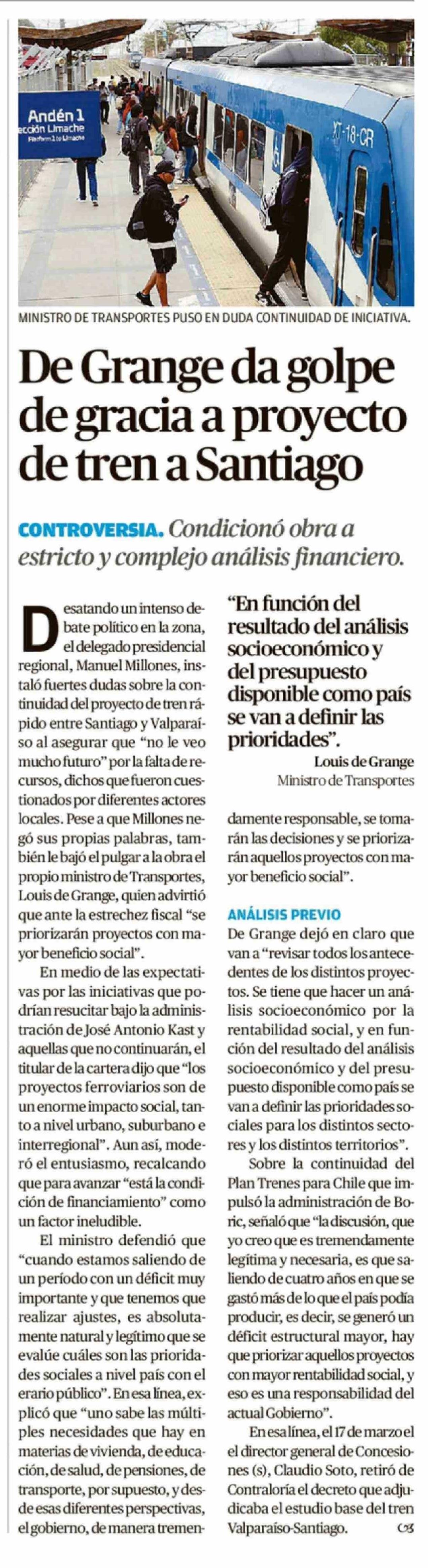 De Grange da golpe de gracia a proyecto de tren a Santiago