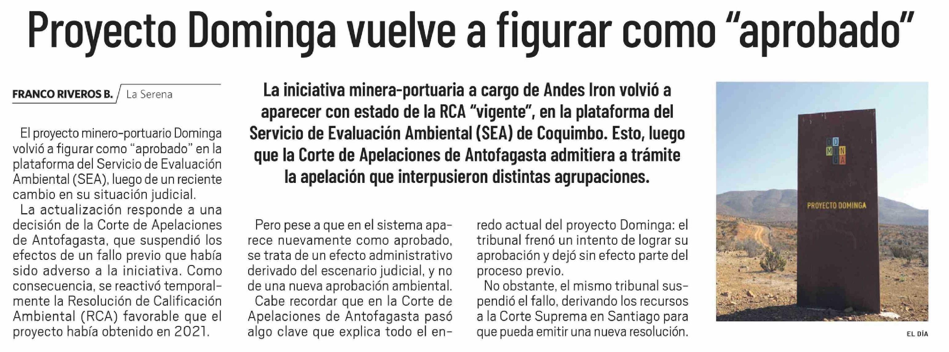 Proyecto Dominga vuelve a figurar como "aprobado"