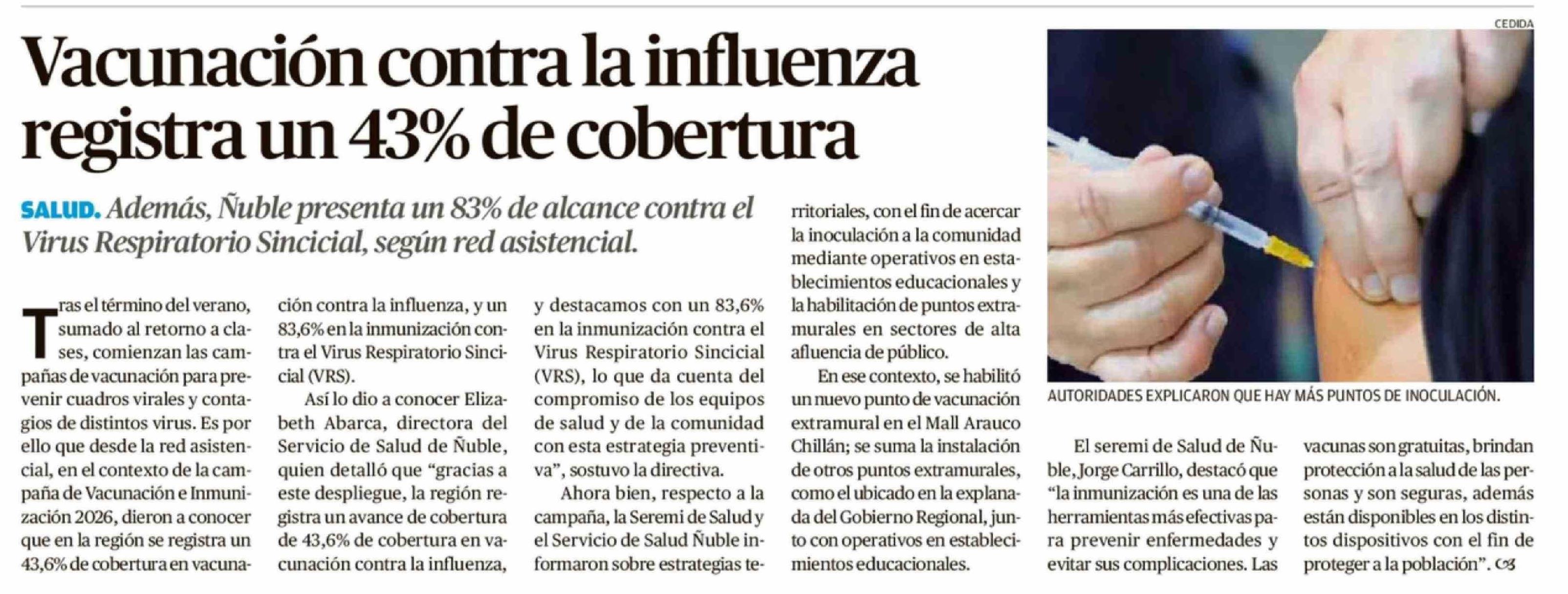 Vacunación contra la influenza registra un 43% de cobertura