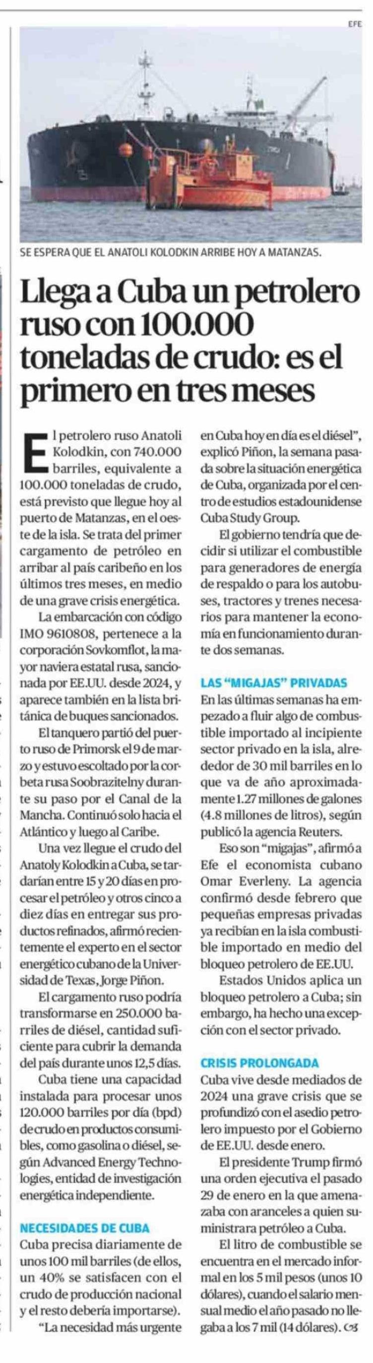 Llega a Cuba un petrolero ruso con 100.000 toneladas de crudo: es el primero en tres meses