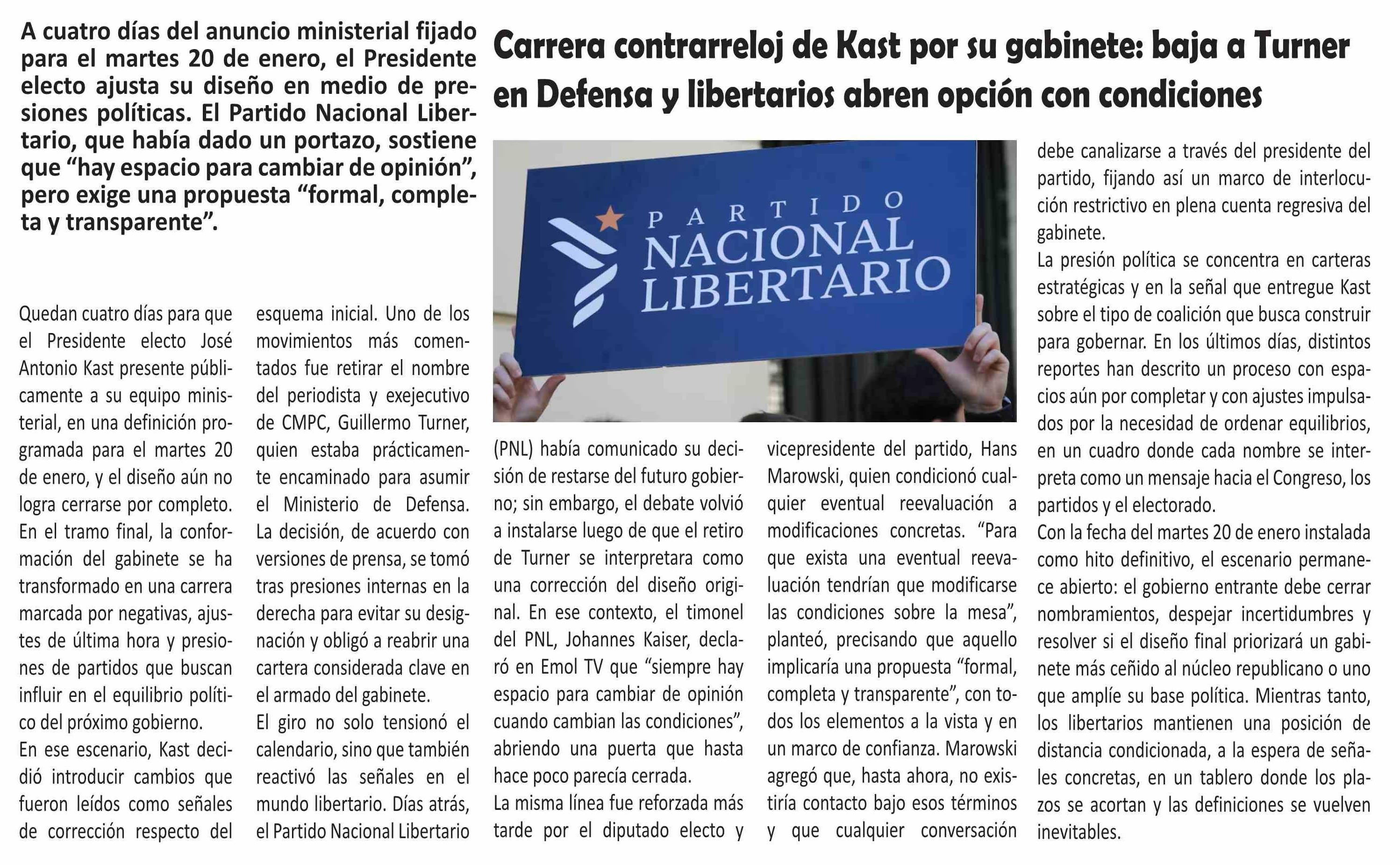 Carrera contrarreloj de Kast por su gabinete: baja a Turner en Defensa y libertarios abren opción con condiciones