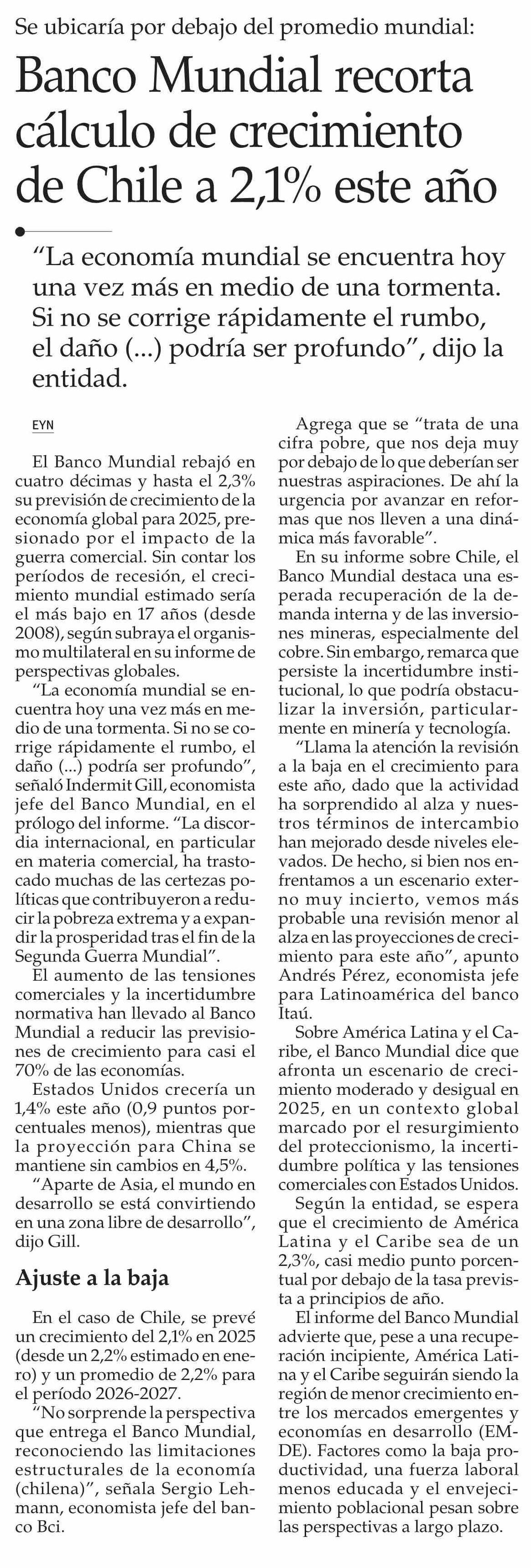 Banco Mundial recorta cálculo de crecimiento de Chile a 2,1% este año