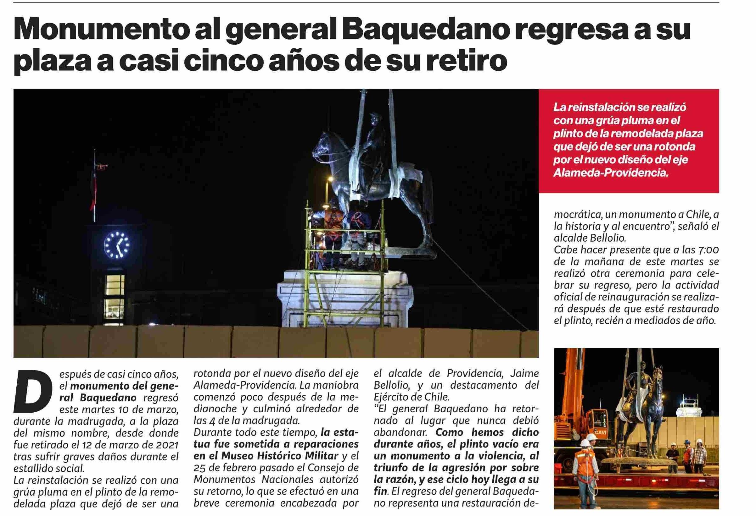 Monumento al general Baquedano regresa a su plaza a casi cinco años de su retiro