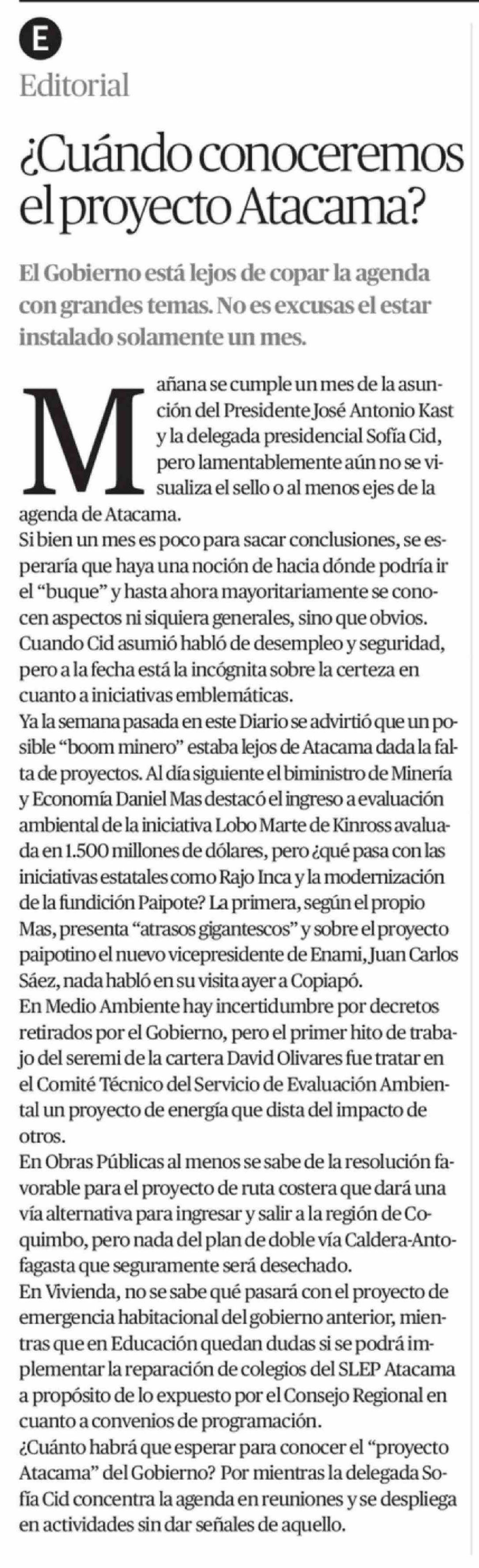 Título: Editorial: ¿Cuándo conoceremos el proyecto Atacama?