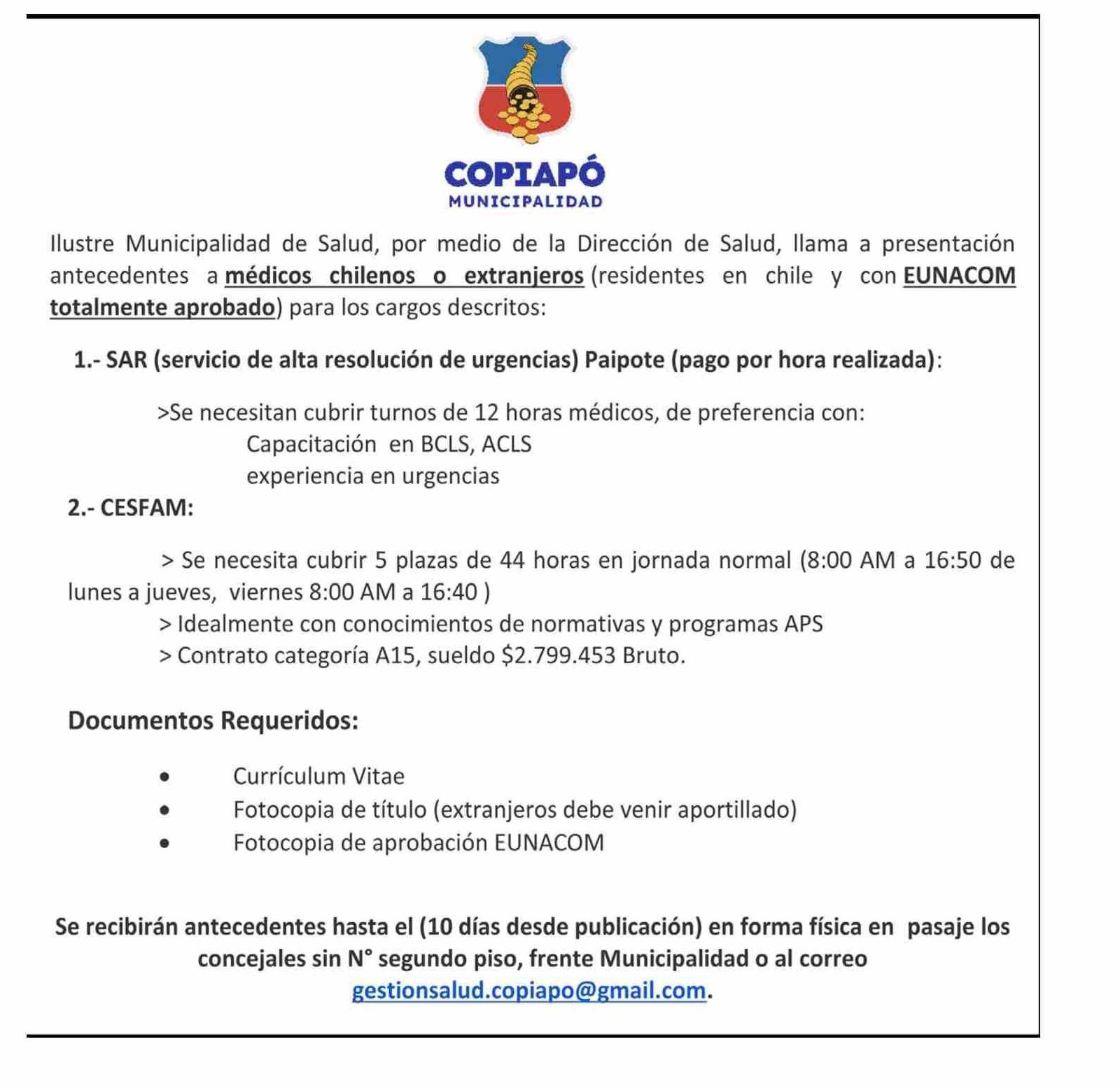 | Título: | AVISO LICITACIONES: llustre Municipalidad de Salud, por medio de la Dirección de Salud, llama a presentación antecedentes a médicos chilenos o extranjeros (residentes en chile y con EUNACOM totalmente aprobado) para los cargos descritos |