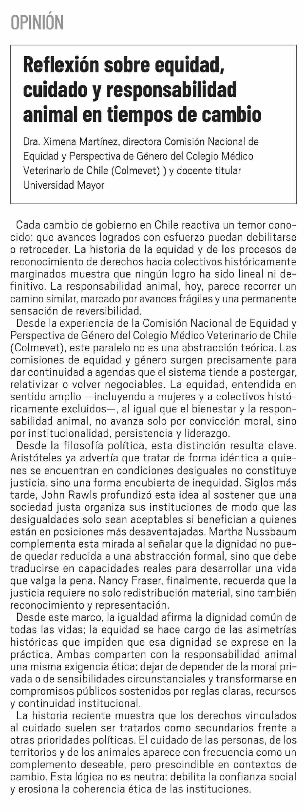 Título: Columnas de Opinión: Reflexión sobre equidad, cuidado y responsabilidad animal en tiempos de cambio