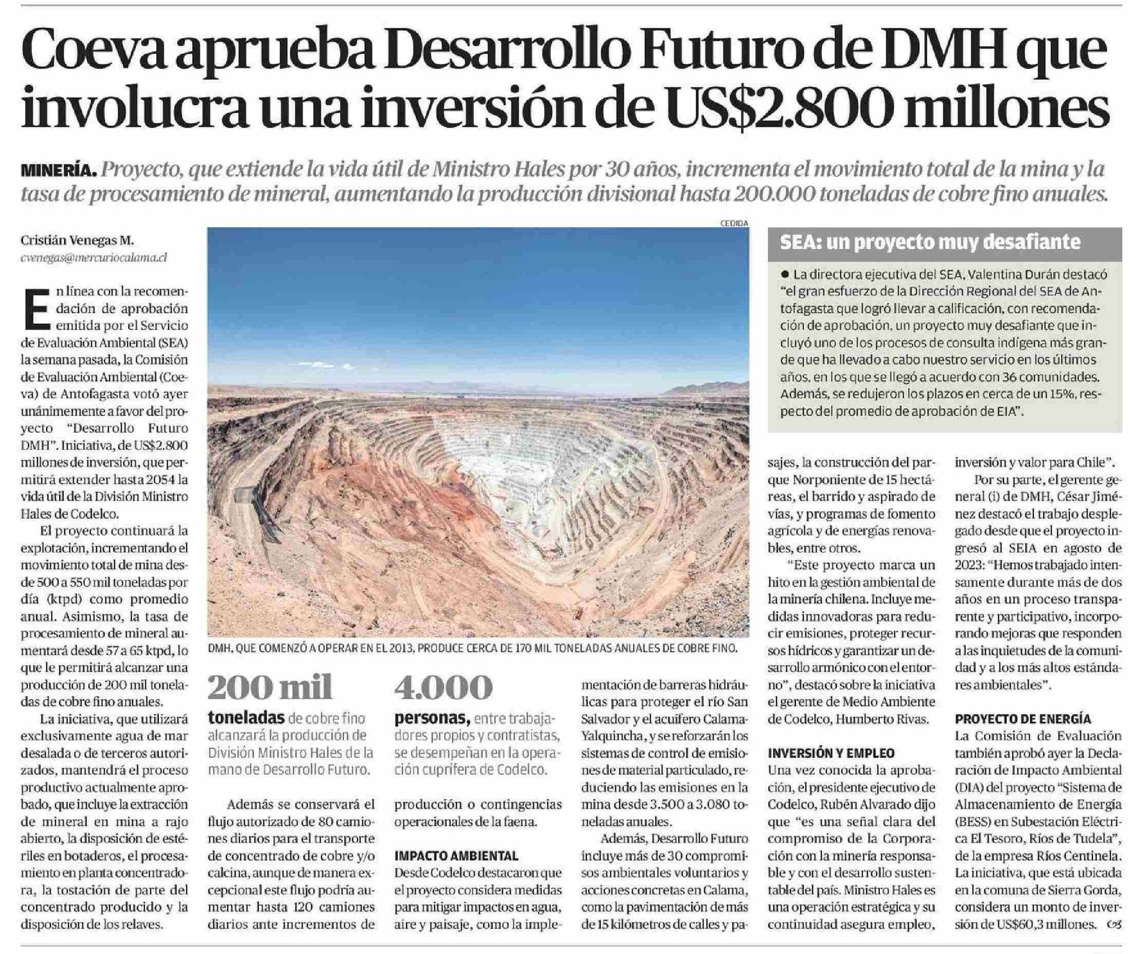 Coeva aprueba Desarrollo Futuro de DMH que involucra una inversión de US$2.800 millones