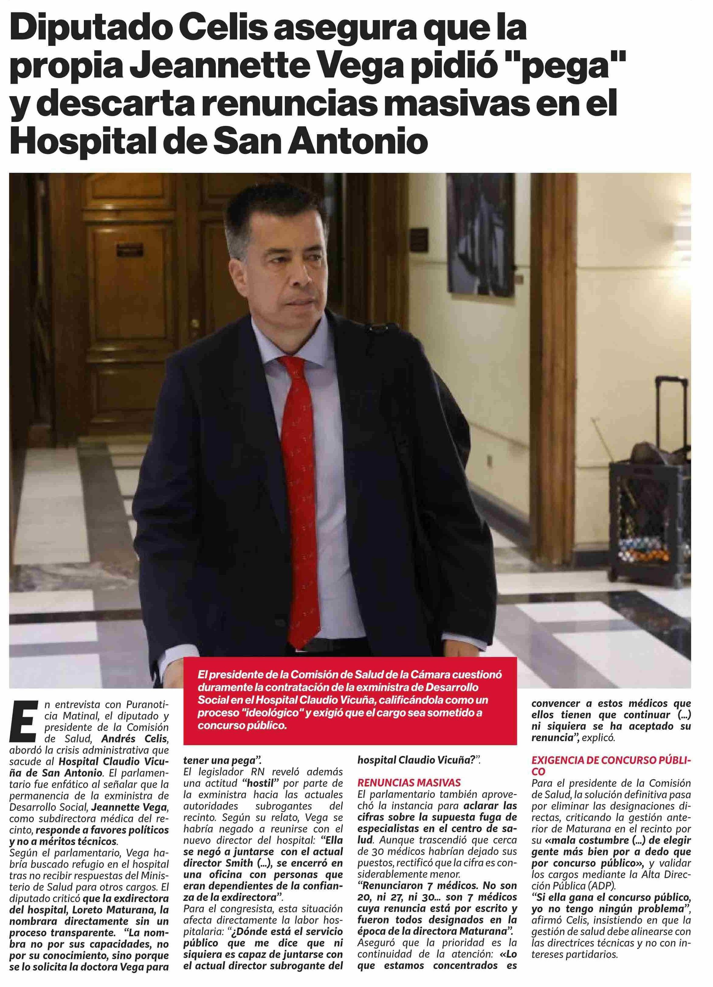 Título: Diputado Celis asegura que la propia Jeannette Vega pidió "pega" y descarta renuncias masivas en el Hospital de San Antonio