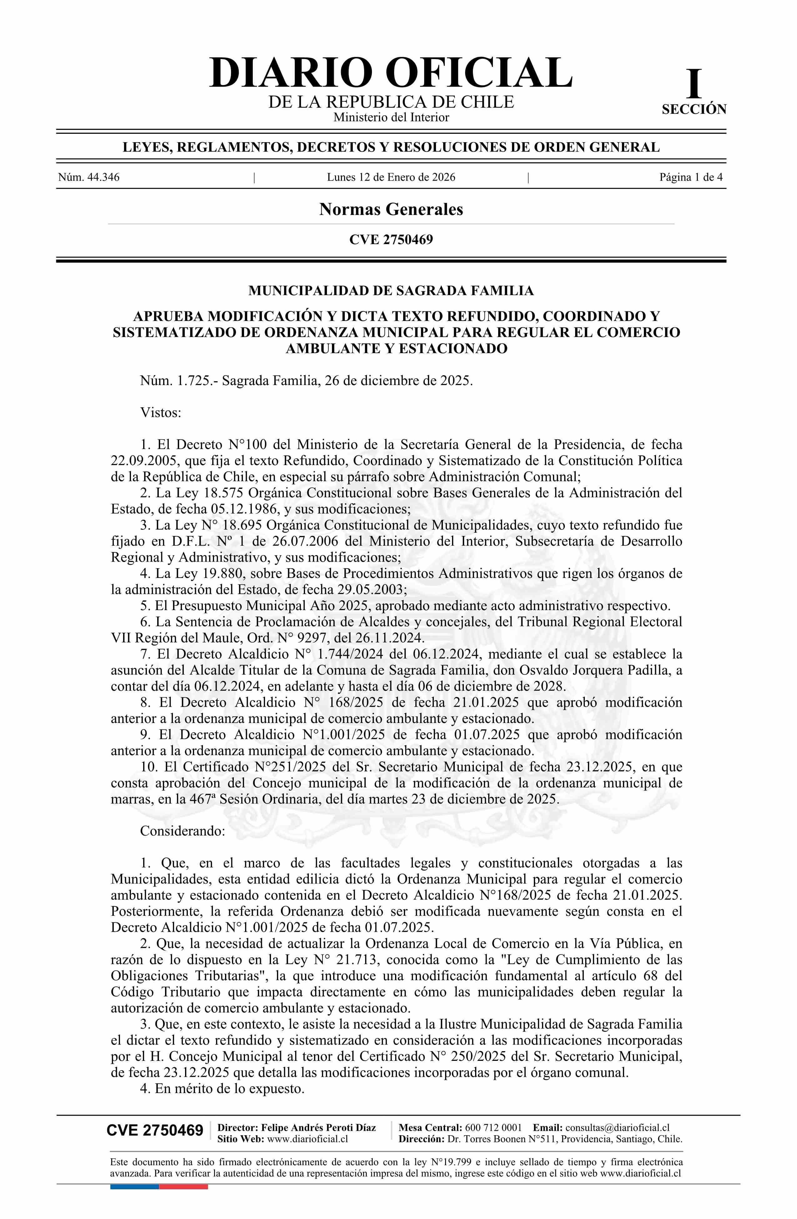 | Título: | Decreto alcaldicio número 1.725, de 2025.- Aprueba modificación y dicta texto refundido, coordinado y sistematizado de Ordenanza municipal para regular el comercio ambulante y estacionado |