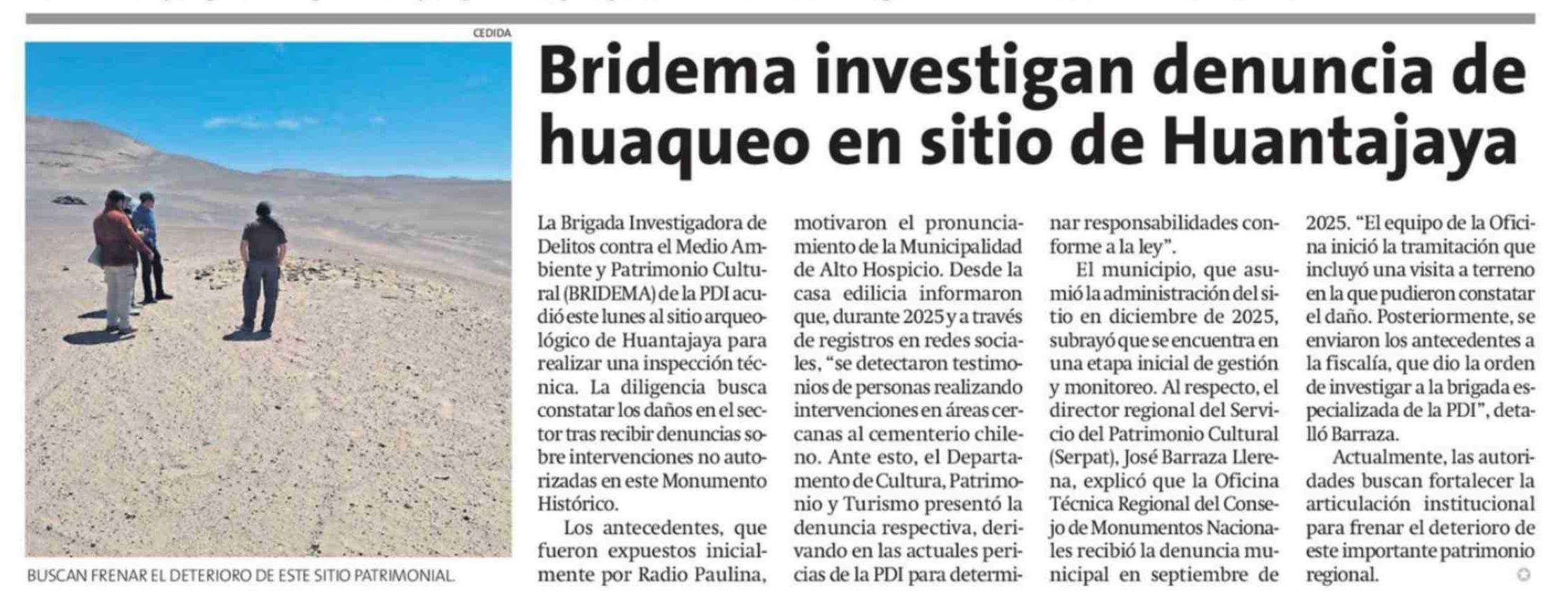 Bridema investigan denuncia de huaqueo en sitio de Huantajaya