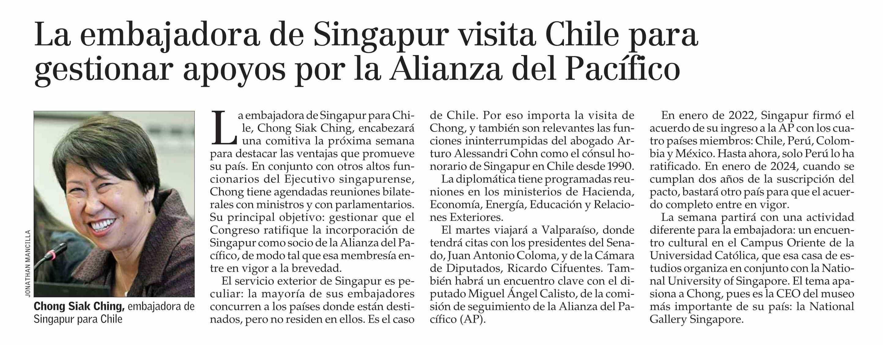 La embajadora de Singapur visita Chile para gestionar apoyos por la Alianza del Pacífico