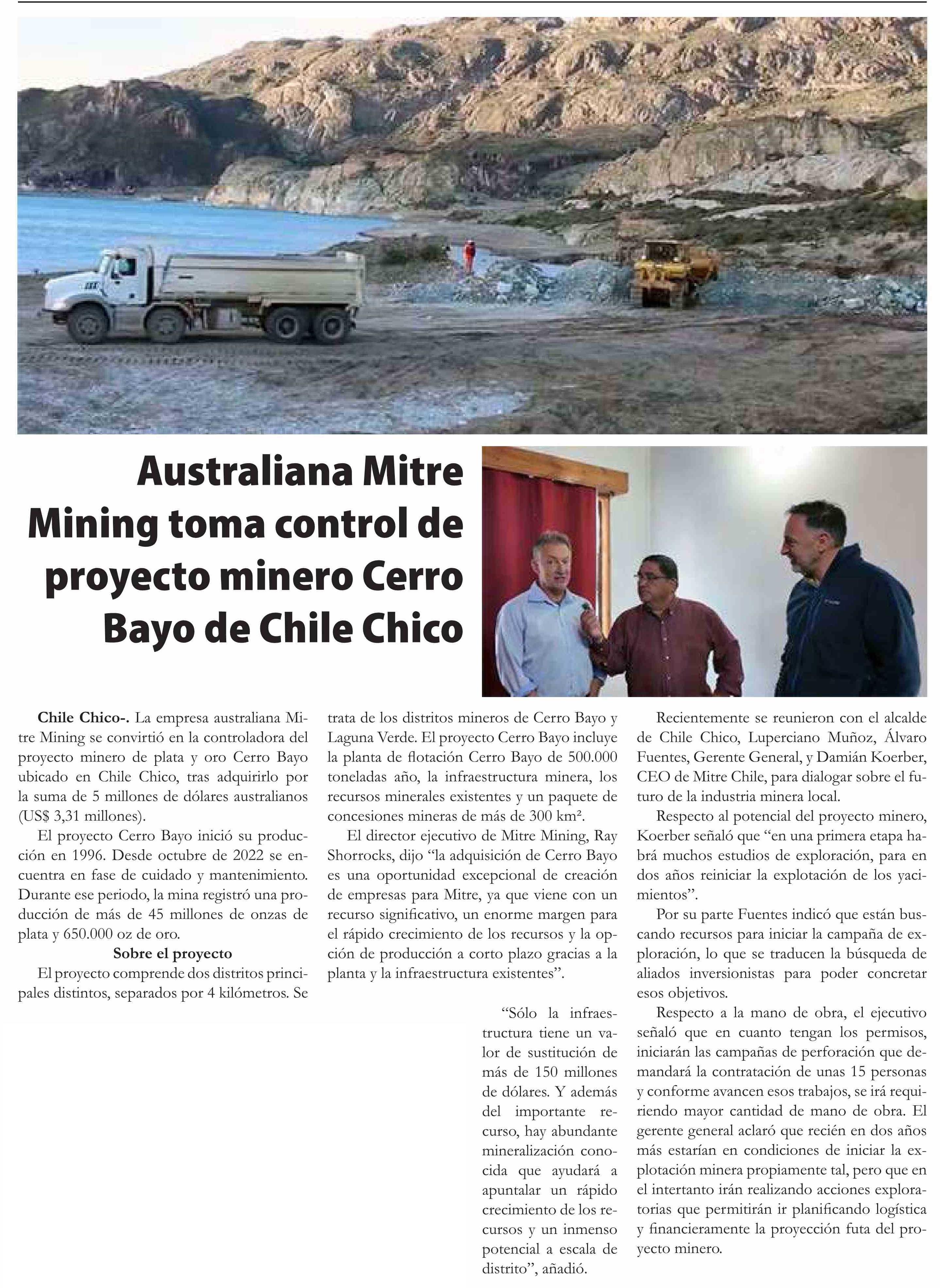 Australiana Mitre Mining toma control de proyecto minero Cerro Bayo de Chile Chico
