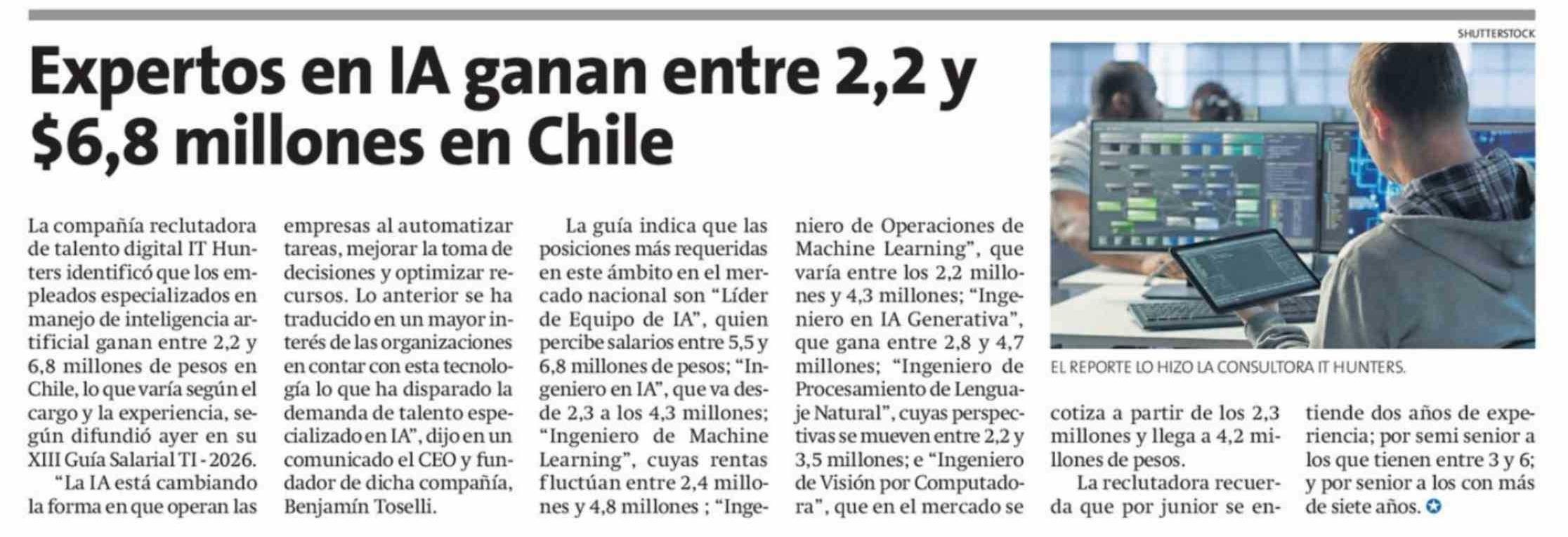 Expertos en IA ganan entre 2,2 y $6,8 millones en Chile 14-04-2026 La Estrella de Antofagasta |