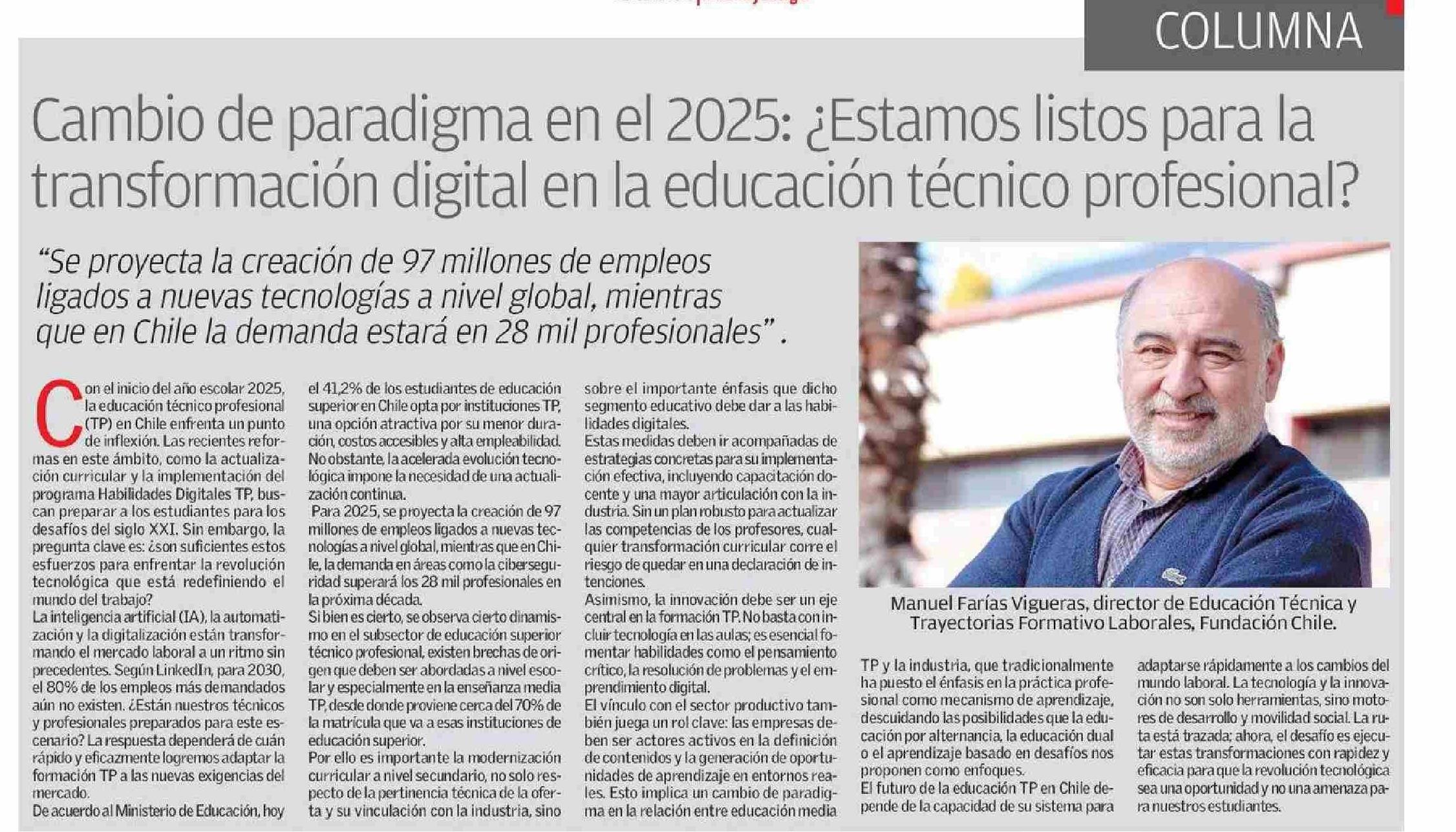 COLUMNAS DE OPINIÓN: Cambio de paradigma en el 2025: ¿Estamos listos para la transformación digital en la educación técnico profesional? 30-03-2025 El Diario de Atacama |