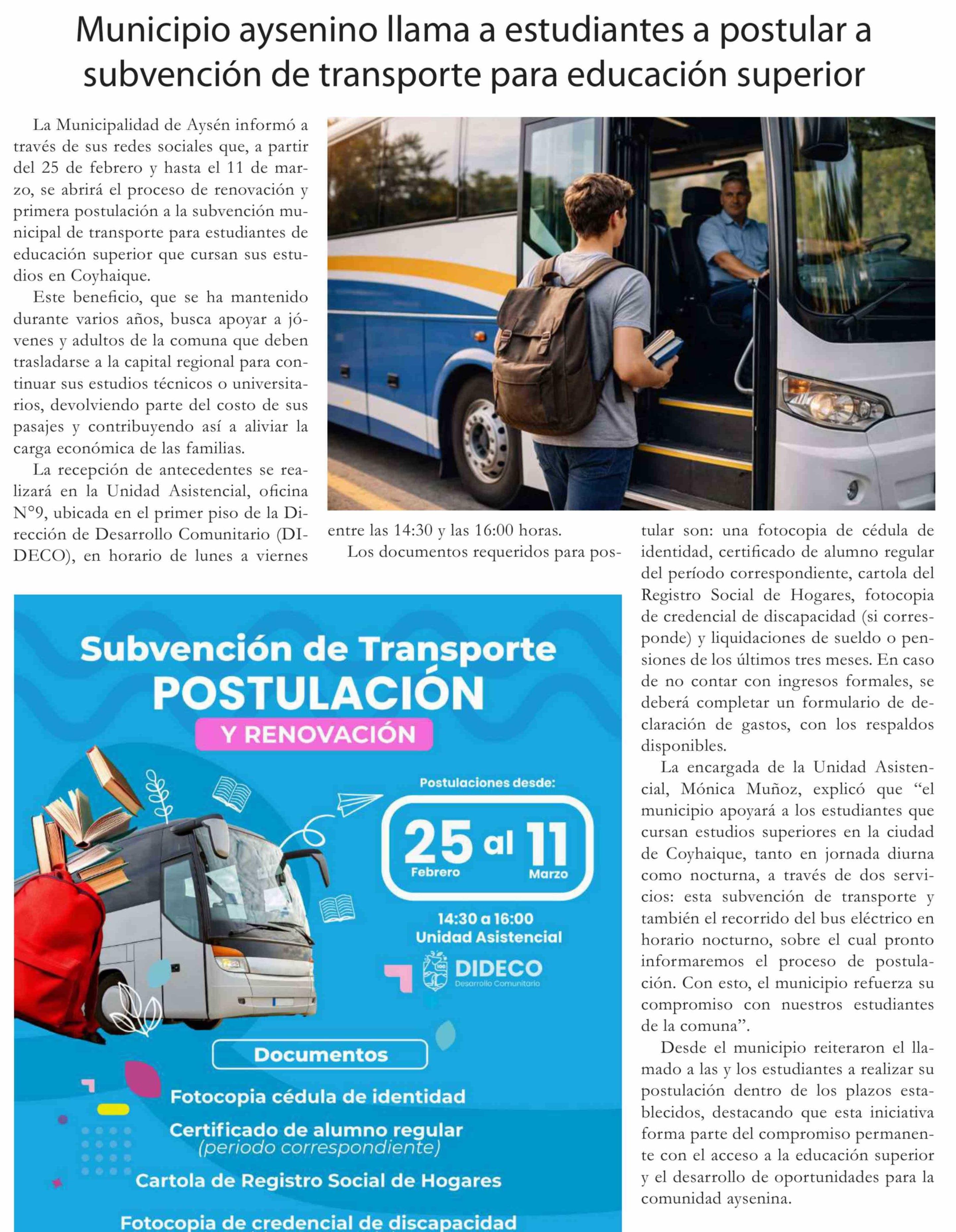 | Título: | Municipio aysenino llama a estudiantes a postular a subvención de transporte para educación superior |